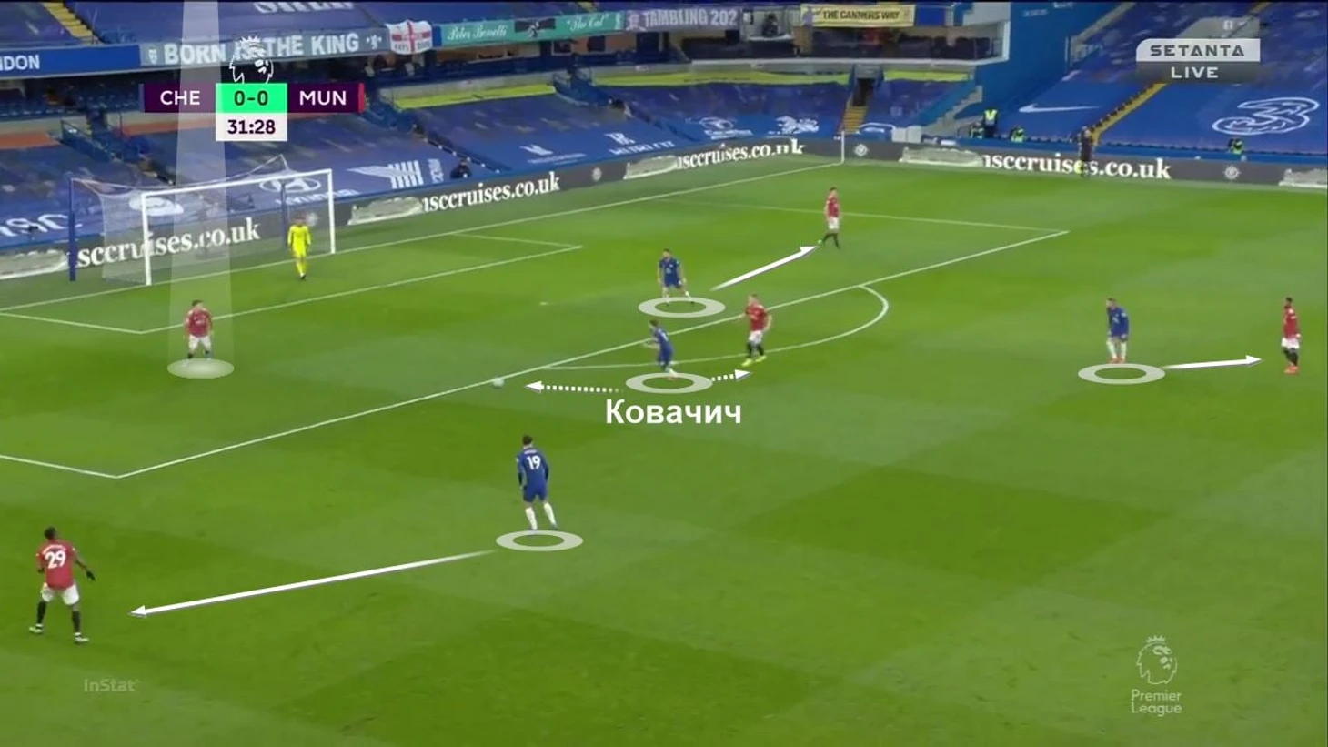 За счет такого двойного сдерживания «Челси» мог контролировать соперника, не используя очень много игроков в давлении. Но эпизодов для начала давления нужно было дожидаться. Вот пример с Ковачичем – здесь он давит на Линделефа и перекрывает Мактомини: