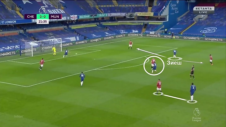 • Зиеш на одной линии с Жиру – оба центральных защитника соперника под давлением;