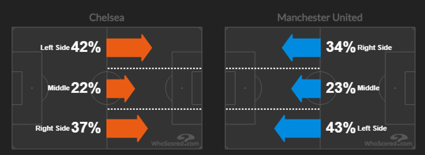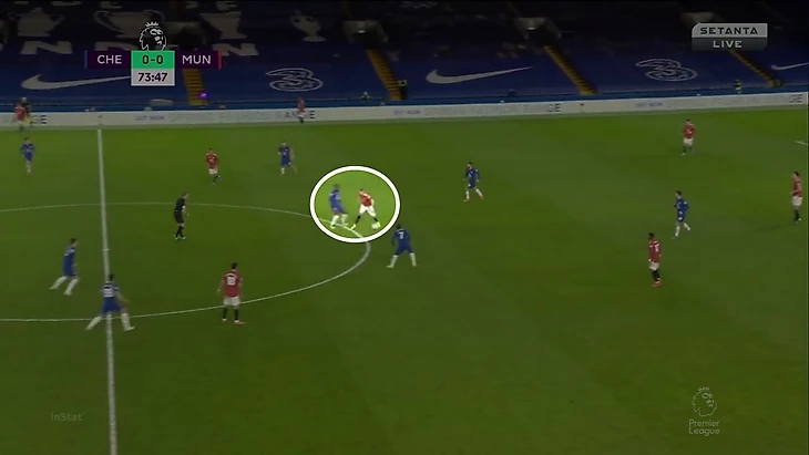 Структурно «МЮ» накрывал оба фланга «Челси» похожим образом, но все равно направлял их для розыгрышей налево, где был Рюдигер, а не Аспиликуэта, а у «Юнайтед» – Дэн Джеймс. Именно через эту зону «Челси» провел наибольшую долю атак, что отличается от стандартной картины (розыгрыши через Аспи).