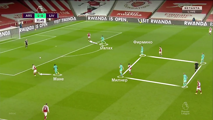 Иногда схема выглядела даже как 4-2-2-2 с Мане и Салахом выше всех. Это было реакцией на перемещения игроков «Арсенала», но базис всегда сохранялся – Мане и Салах играют по центральным защитникам, центр максимально перекрывают, фланги не перекрываются сразу, но контролируются на случай паса: