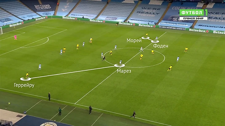 Как отметил выше, система предполагала высокие позиции Морея и Геррейру. Они растягивали схему «Сити» и ставили в неудобные условия Фодена и Мареза. Те разрывались между помощью в прессинге и игрой по своим соперникам.