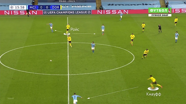 Первая – Бернарду и КДБ разрываются, кто-то из тройки получает свободу и возможность отдать между линиями. Туда поочередно опускались Ройс, Холанд и неожиданно вышедший в старте (37 минут в Бундеслиге) Ансгар Кнауфф: