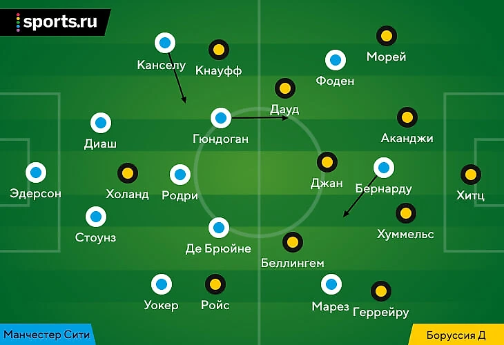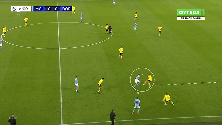 Ключевым вызовом для «Сити» была стартовая стадия розыгрышей. Там у «Дортмунда» изначально был перевес – тройке из Аканджи, Хуммельса и Джана противостояли только Бернарду и КДБ. У пары из «Сити» не получалось компенсировать разницу в одного игрока своевременными смещениями (от опорника к защитникам и наоборот) – гости занимали отличные позиции, чтобы соперники постоянно разрывались.