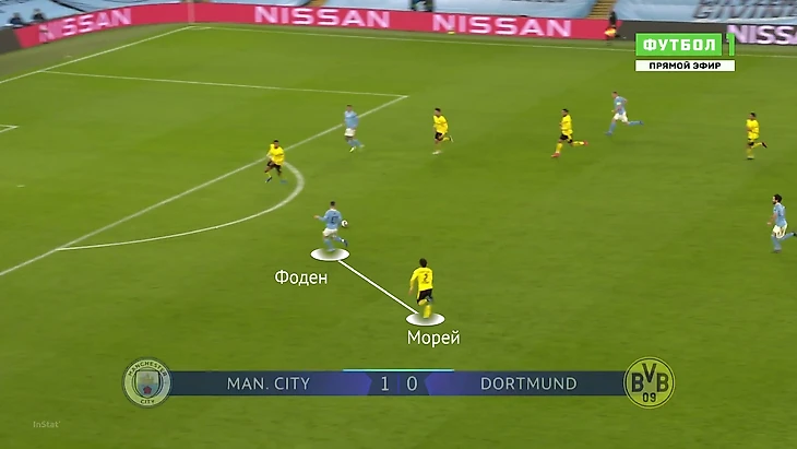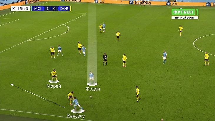 Жоау отдает на Фодена, по которому играет Морей, и сразу показывает, что будет подключаться по флангу. Морей замечает это и в страхе оголить зону бросает Фодена. Фил получает свободу: