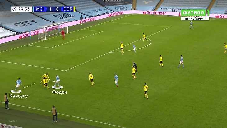 Канселу забегает за спину Морею и вынуждает разрываться Аканджи – тот мечется между португальцем и Фоденом. Фил использует это и уходит в штрафную на противоходе: