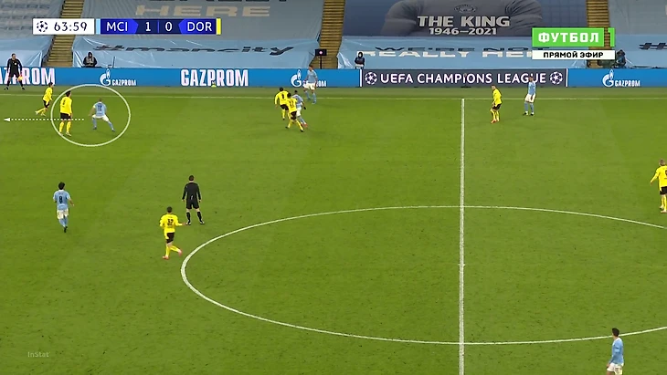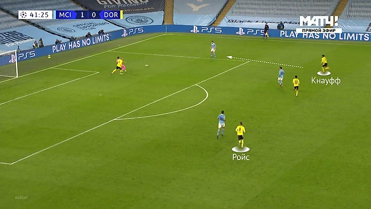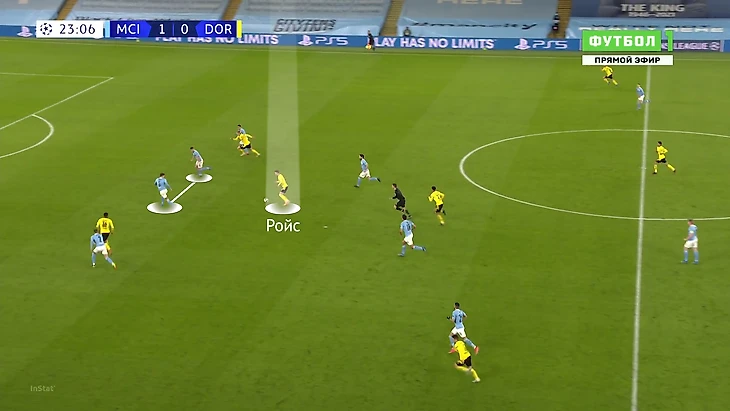 Неудивительно, что «Боруссия» отыгралась, когда защитник не справился с дилеммой. Перед голом Холанд опустился в опорную, Стоунз не принял четкого решения – не пошел за Эрлингом до конца, но и раскрыл свою зону. В результате норвежец и получил мяч, и нашел пространство для передачи Ройсу.