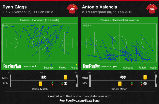 Стоит отметить и еще одного черноволосого кардинала манкунианской полузащиты, известного под кодовым названием «валлийский волшебник». В этом поединке он помог команде сэра Алекса Фергюсона создать численное преимущество в центре на подступах к штрафной «Ливерпуля». Растерянному Спирингу наверняка хватило бы в оппоненты и кого-то одного из пары Каррик-Скоулз, но в добавок к ним раз за разом перед его глазами возникала фигура Райана Гиггза со словами «попробуй, догони». Своим Графиком Майкл Кокс показывает насколько чаще еще один ветеран «красных» принимал мяч в центре, нежели другой вингер команды Антонио Валенсия. Подобная игра Гиггза в стиле второй «десятки» открывала больше возможностей на этом фланге в атаке как для одной, так и для второй команды, но воспользоваться этим фактом удалось только «Юнайтед».