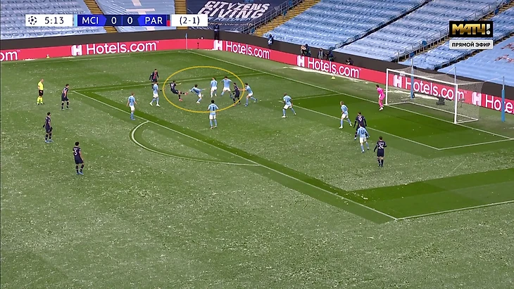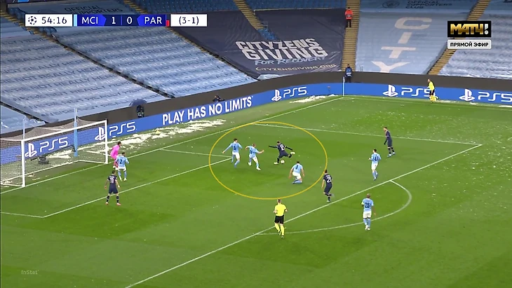 На первом скриншоте удар пытаются заблокировать три игрока «Сити»: