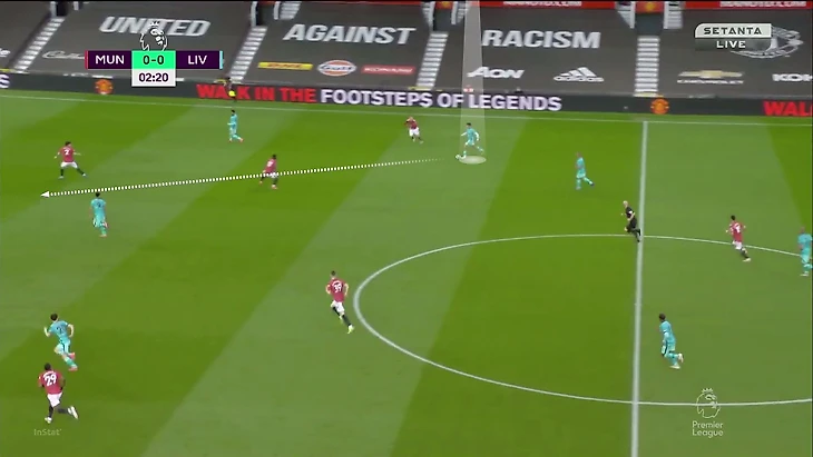 13. Еще один источник моментов «Ливерпуля» (на протяжении всего матча, а не тайма) – вертикальные атаки на скорости. Здесь было два основных сценария. Первый – неудачные стандарты «МЮ» у ворот Алиссона. Второй – мощные передачи Трента сразу после отбора на своей половине.