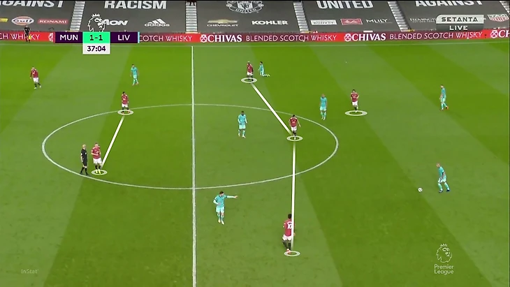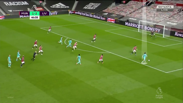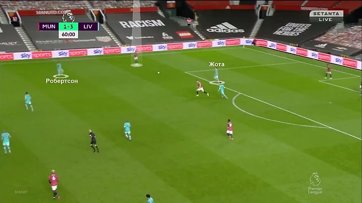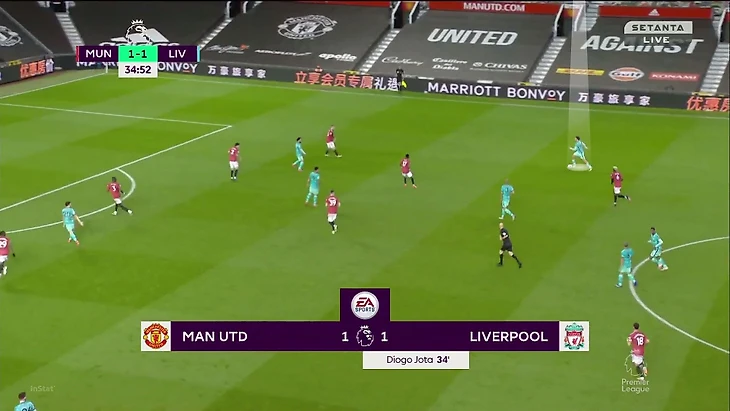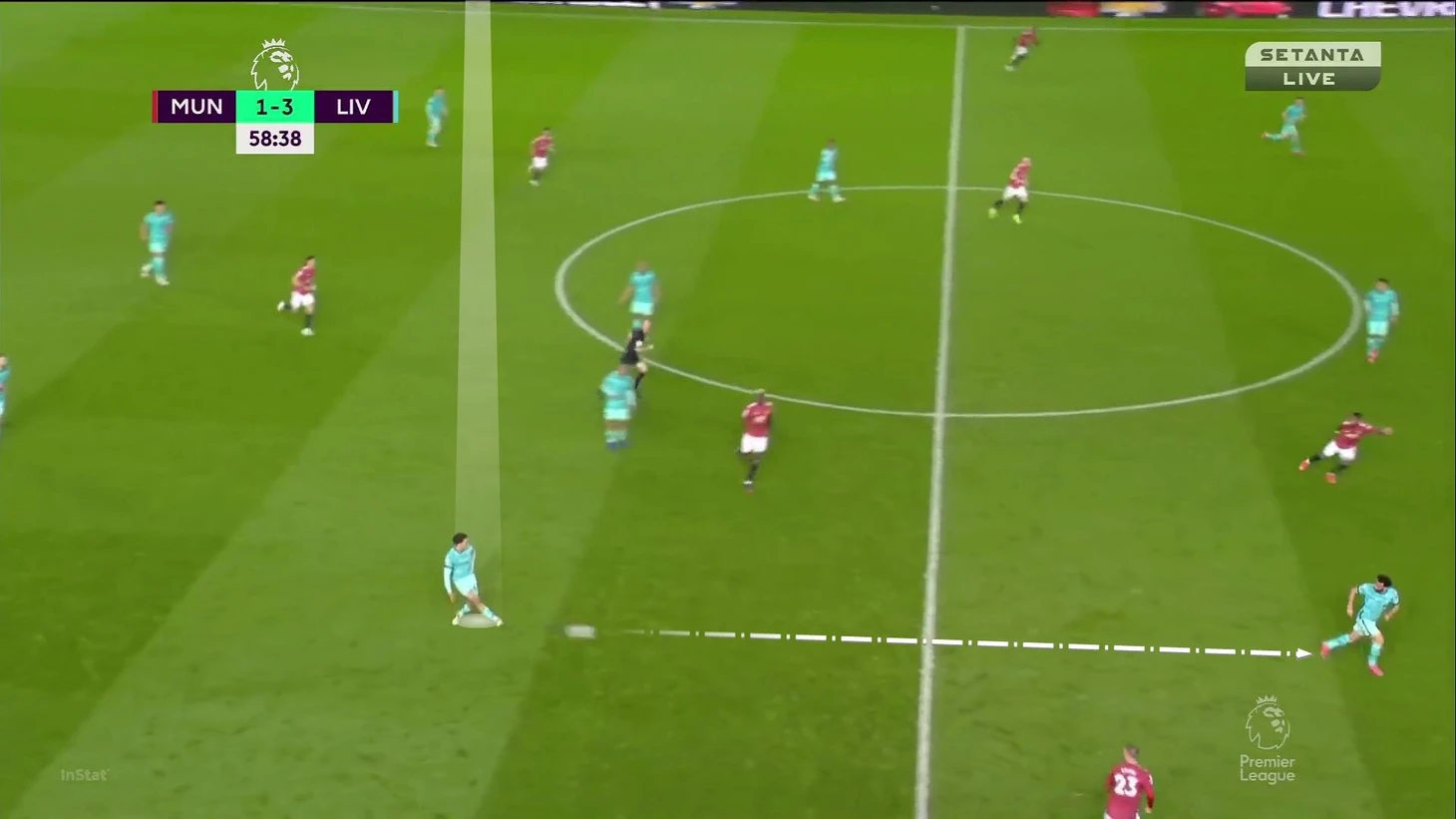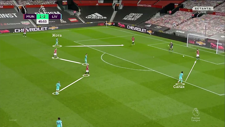 «МЮ» использовал смешанную систему опеки, в которой Жоту никто не опекал (как и футболистов на границе штрафной). Иронично, что в первом голе все эти микродетали сыграли за «Ливерпуль» (Салах пробьет с границы, а Жота завершит атаку):