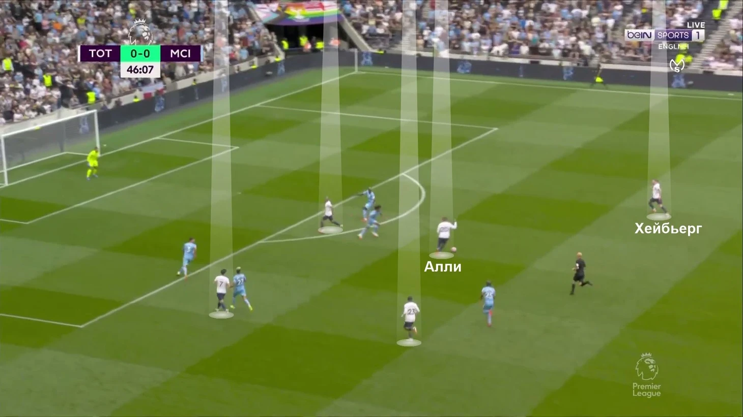 9. Контратаки «Тоттенхэма» в начале второго тайма стали особенно смелыми. Несколько раз хозяева отрывались и могли забивать второй. Отчасти это связано со спешкой и лишними потерями «Сити». Отчасти с тем, что теперь «Тоттенхэм» выбегал вперед не тройкой, а пятеркой – Хейбьерг и Алли тоже поддерживали: