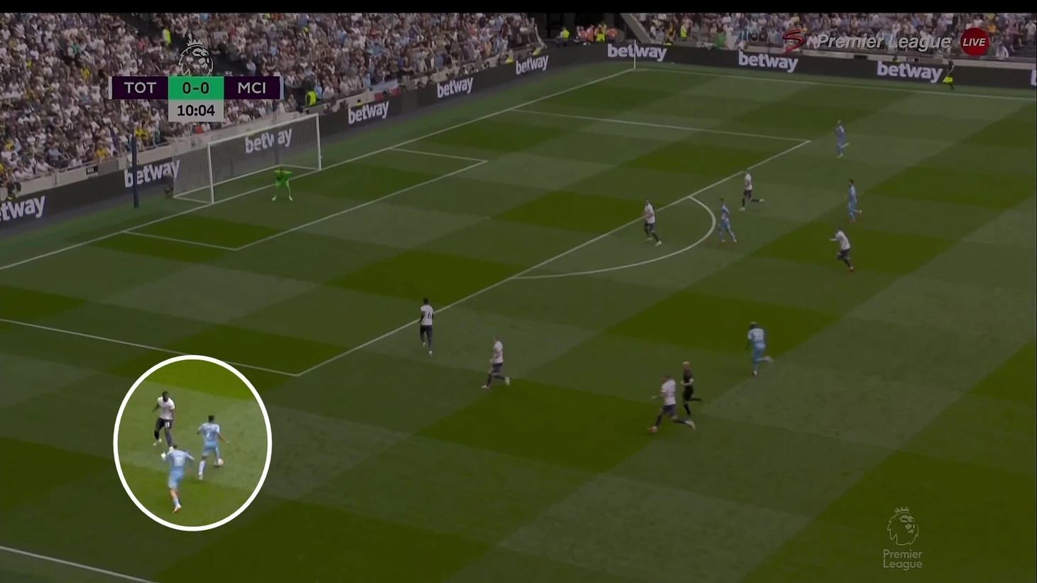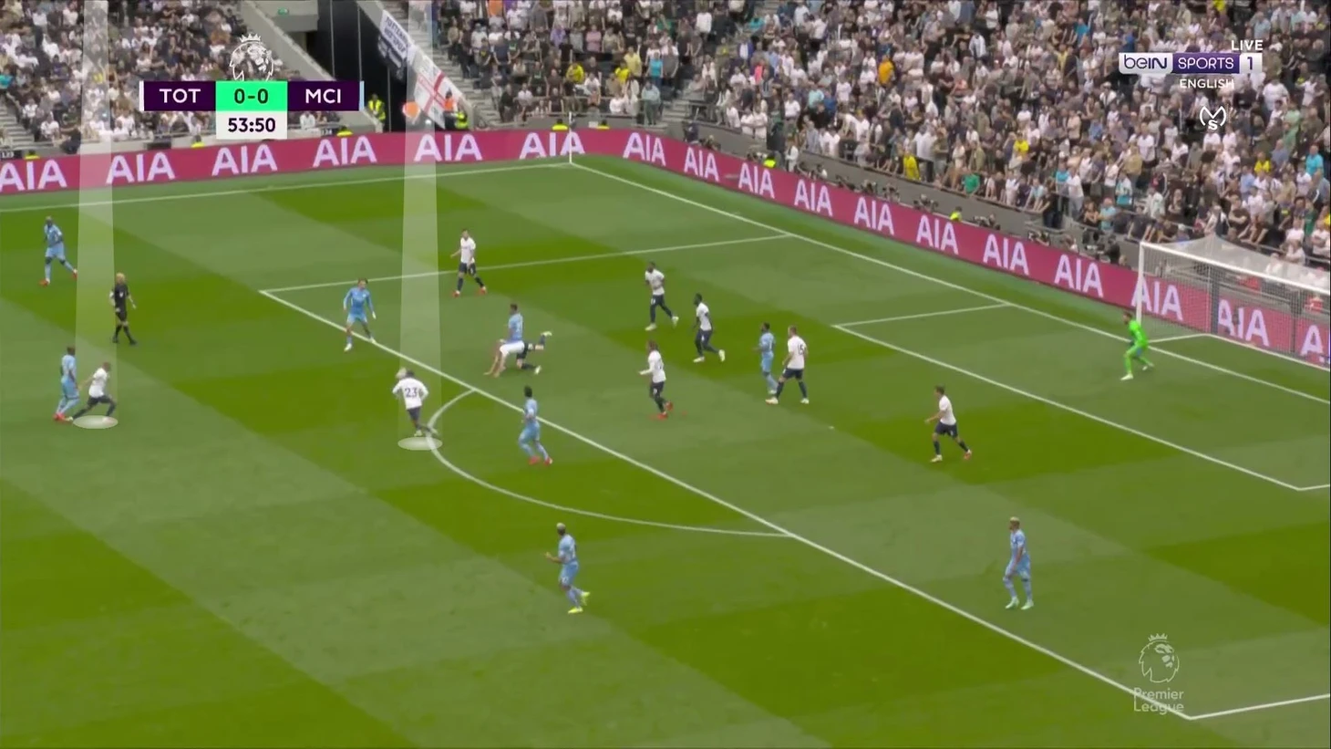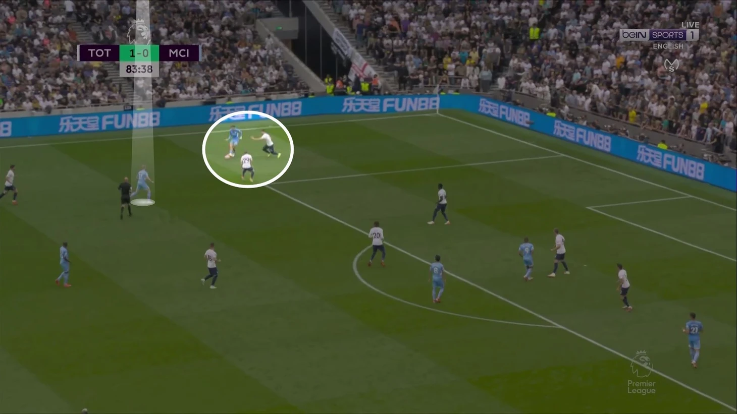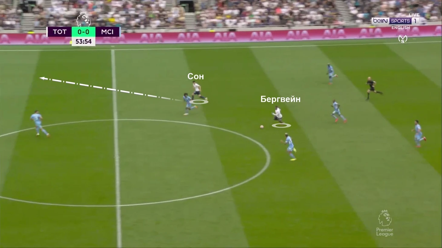 Начало второго тайма (особенно отрезок сразу после гола Сона) – поплывший «Сити» и особенно остро убегающий «Тоттенхэм». На этом отрезке «Сити» стал допускать слишком много лишних потерь (видимо, сказалась спешка после пропущенного гола) – это дарило сопернику идеальные шансы для быстрых выпадов.