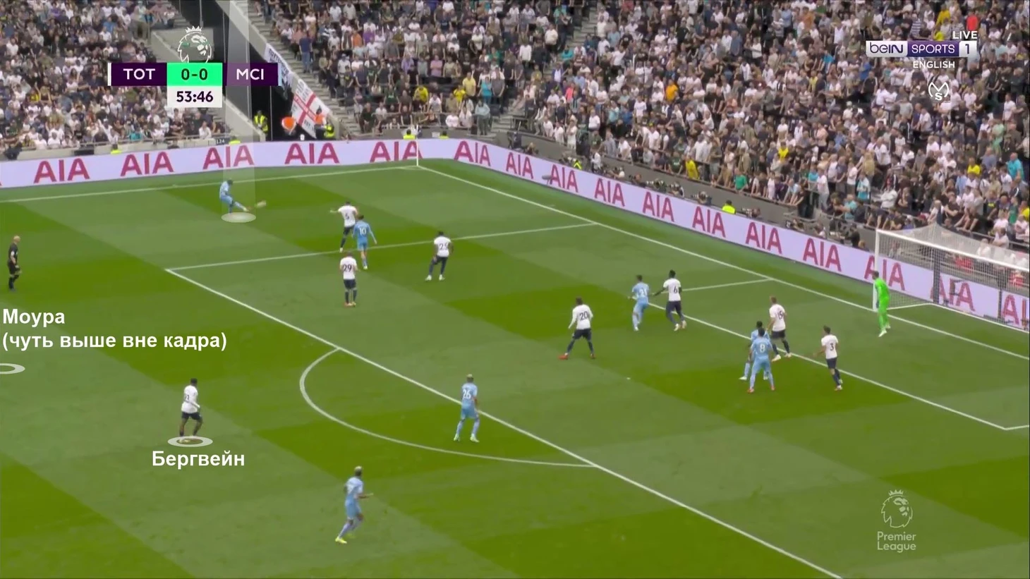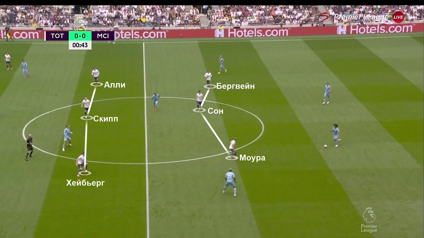 5. Позиции тройки Моура, Сон, Бергвейн при обороне – ключ к пониманию рисунка матча. Они располагались максимально узко и оставались в центральной зоне даже по мере продвижения атаки «Сити»: