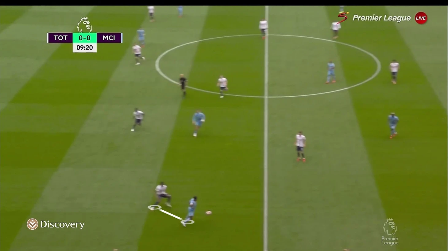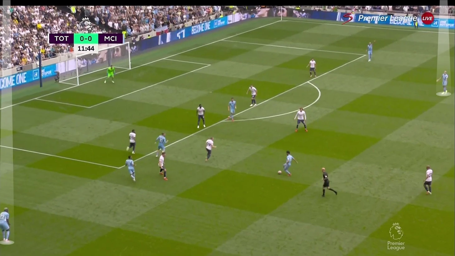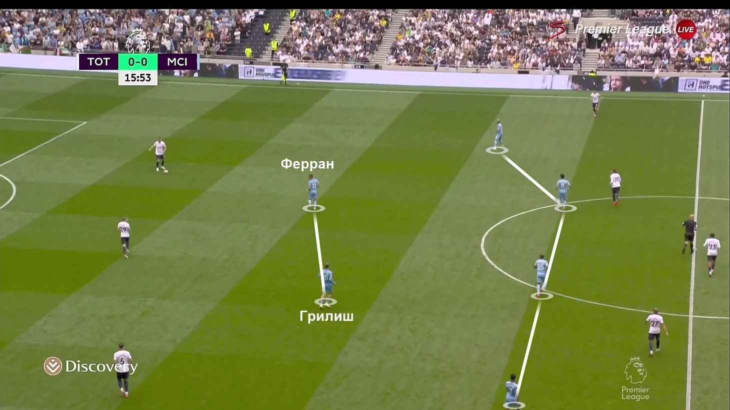13. Если можно найти изъян в перфомансе «Тоттенхэма», то это построение собственных атак. Нуну не отказывался от розыгрышей полностью, но у команды почти ничего не получалось под прессингом «Сити» и в позиционных атаках. По традиции прошлого сезона команда Гвардиолы в такие моменты переходила на 4-4-2 (Грилиш выдвигался к Феррану):