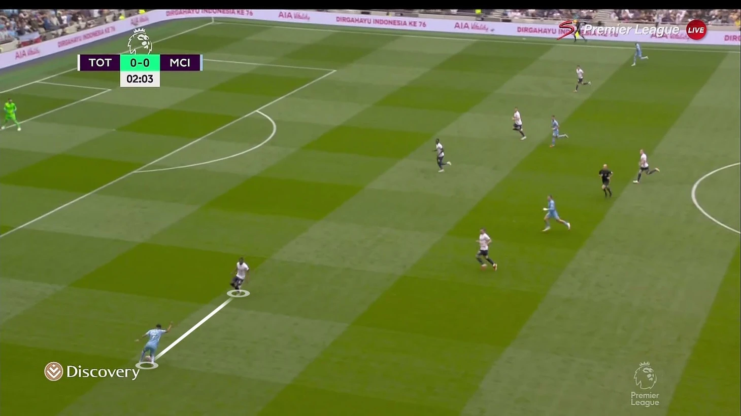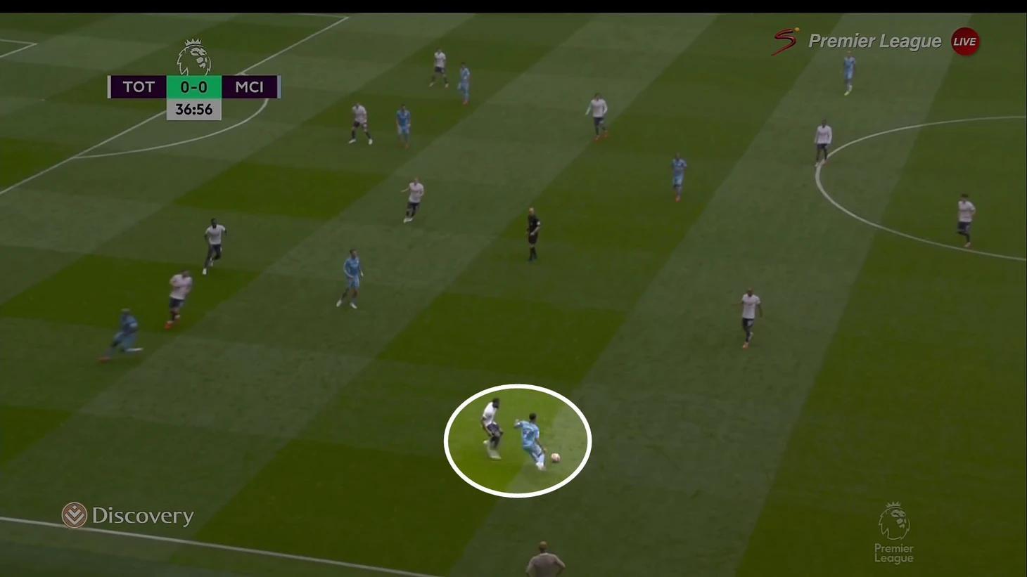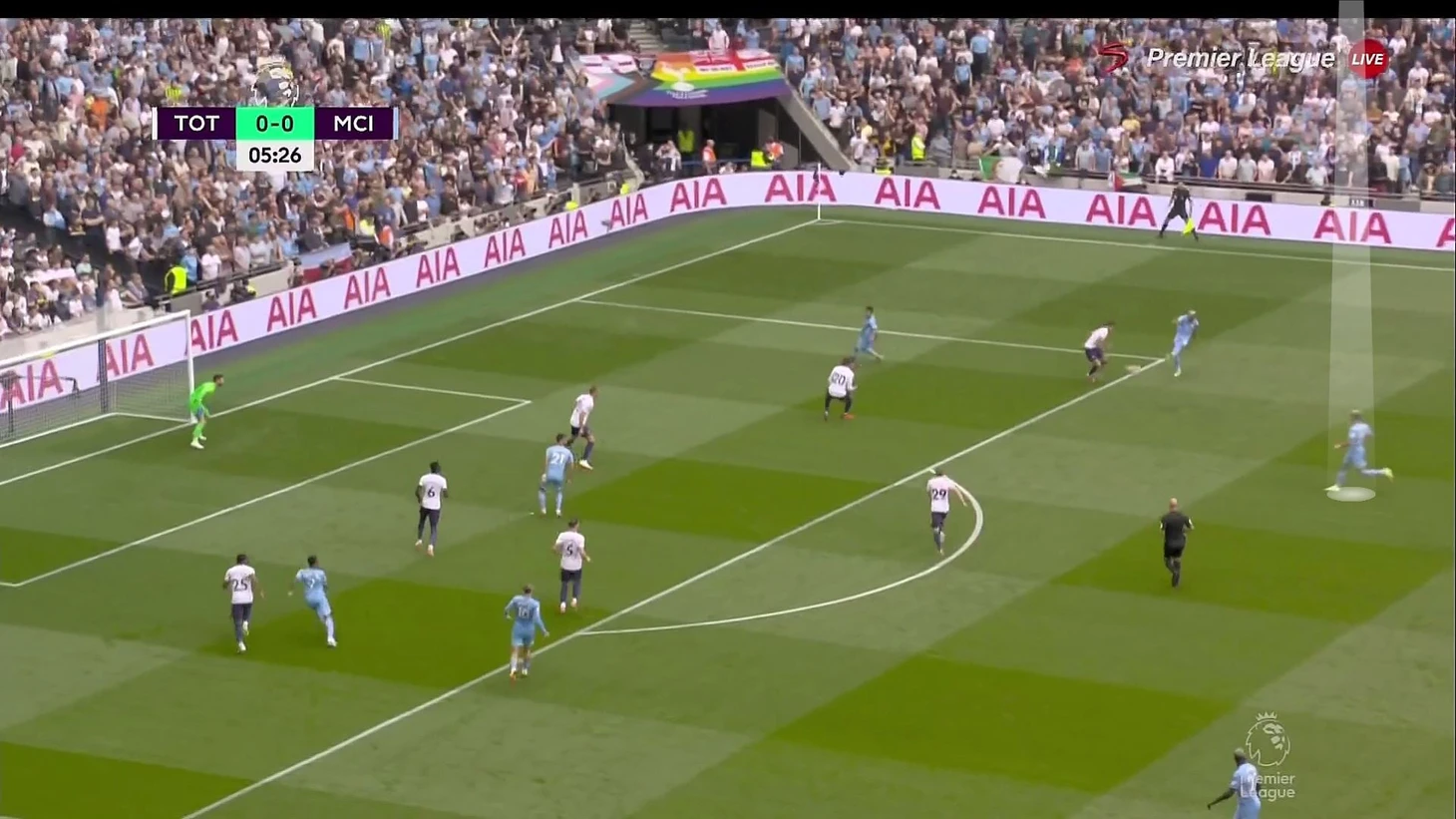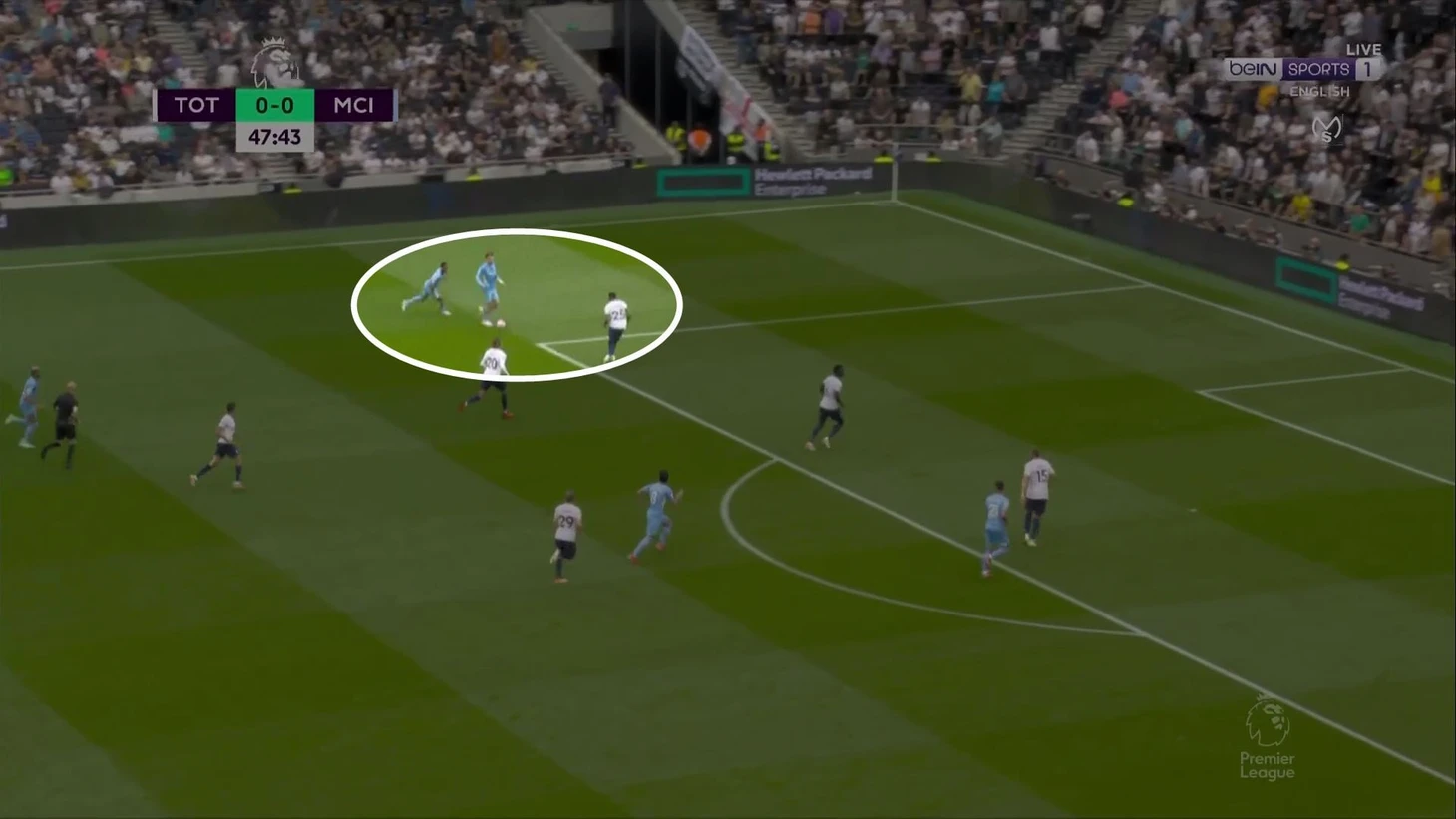 13. Если можно найти изъян в перфомансе «Тоттенхэма», то это построение собственных атак. Нуну не отказывался от розыгрышей полностью, но у команды почти ничего не получалось под прессингом «Сити» и в позиционных атаках. По традиции прошлого сезона команда Гвардиолы в такие моменты переходила на 4-4-2 (Грилиш выдвигался к Феррану):
