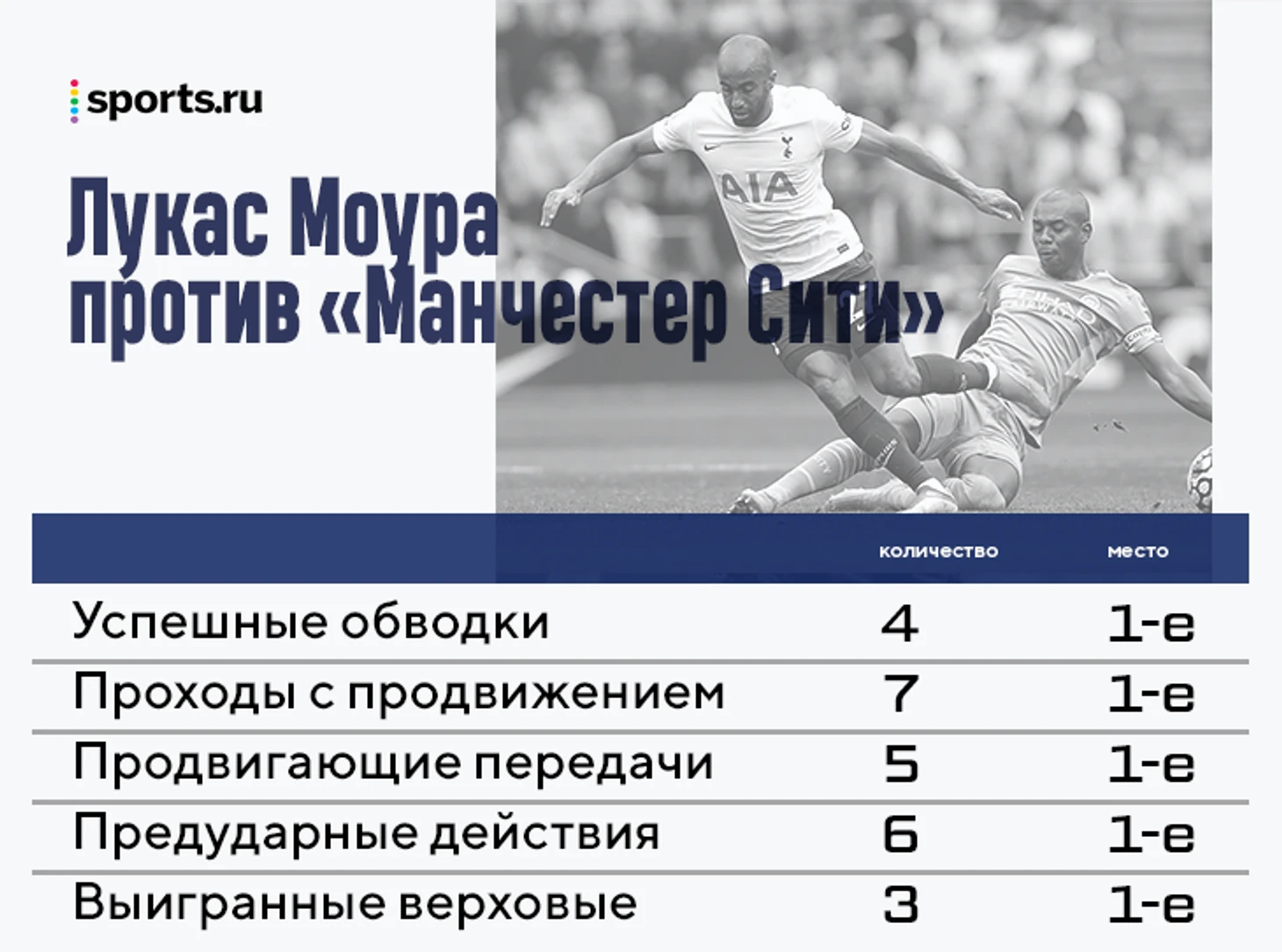 У Сона и Бергвейна 20 полученных продвигающих пасов. У всей остальной команды – 8. Они убегали и открывались, а Моура связывал самыми разными методами (пасы, проходы и даже борьба за верховые мячи). Бразилец также больше работал при обороне – опускался при совсем затяжных атаках соперника. Во всех описанных вещах он был очень хорош.