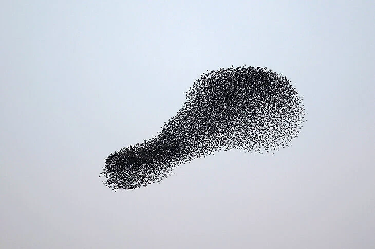 Интересно, что такие парные взаимодействия найдены и у птиц, для которых характерна иная форма стай. Например, у галок. Летящие рядом родичи подстраиваются друг под друга, облегчая перелет, но вся стая выглядит совершенно неорганизованной. В этом тоже есть смысл: когда птицы летят роем, хищнику сложнее выхватить жертву из общего скопления. Чем плотнее стая, тем лучше защита, и тем слаженнее выглядят действия птиц в стае. Она кажется подобной единому суперорганизму.