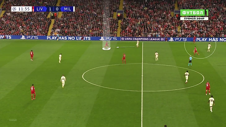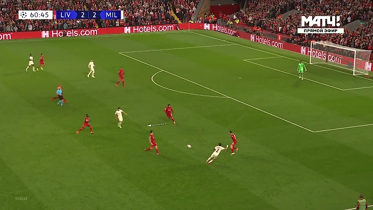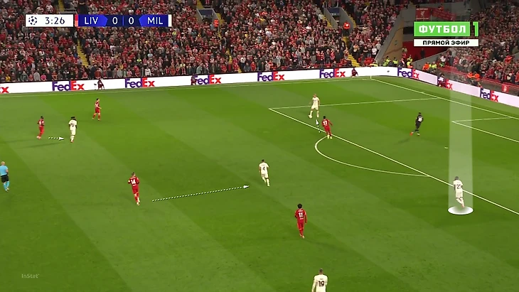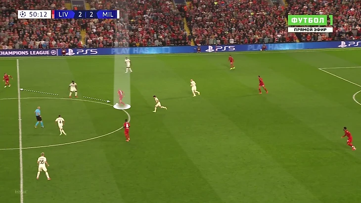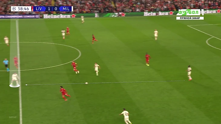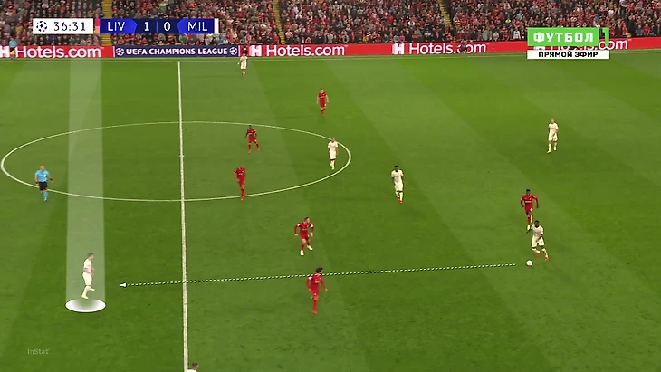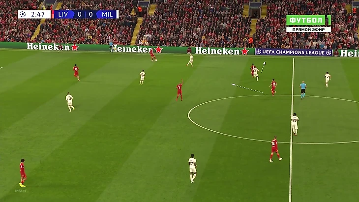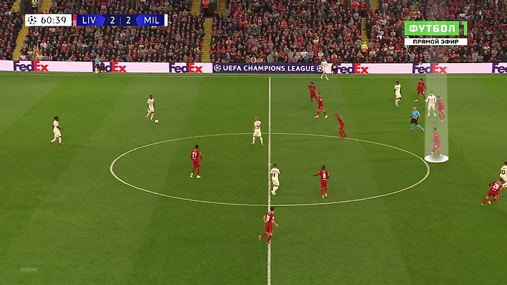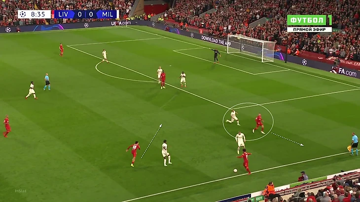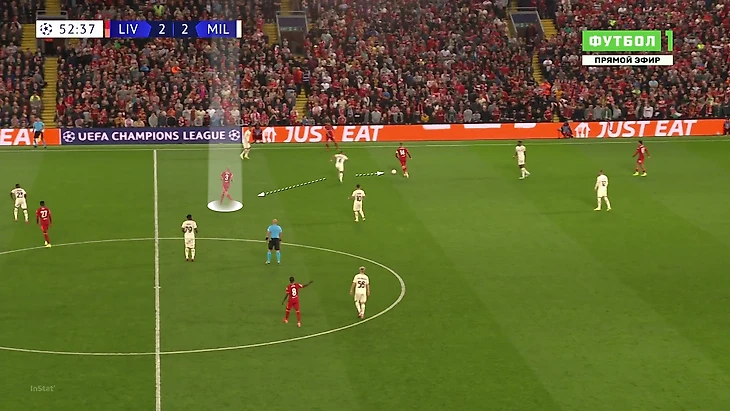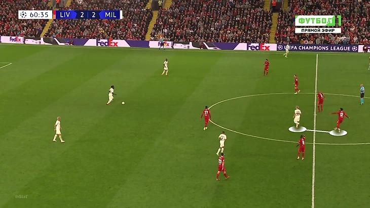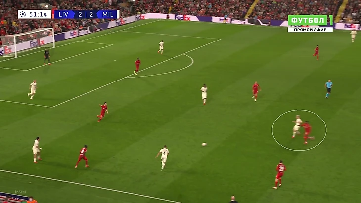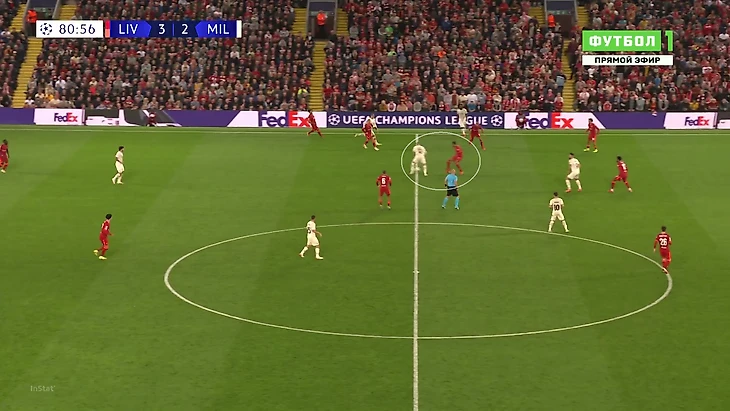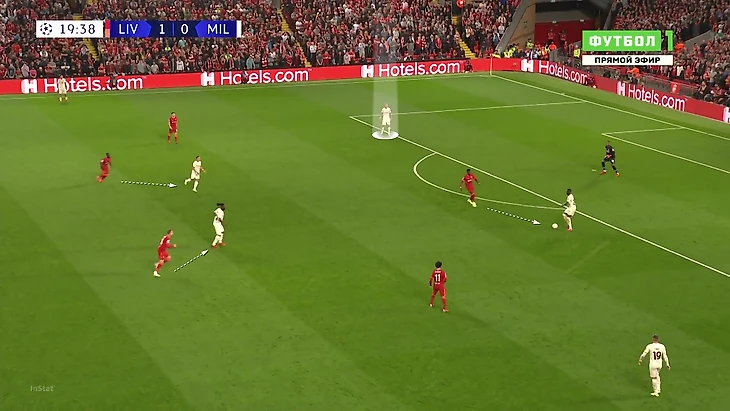 «Милану» приходилось либо выбивать на фланги, либо тупо вперед. Шансов зацепиться за мяч там было минимум, даже если заброс был точным: на флангах ограничено пространство из-за боковой линии, сзади у «Ливерпуля» мощные Матип и Гомес. Крутость давления подчеркивает то, что в первые 25 минут «Милан» сделал на чужой трети поля только 7 передач (2 из них – от вратаря Майка Маньяна).