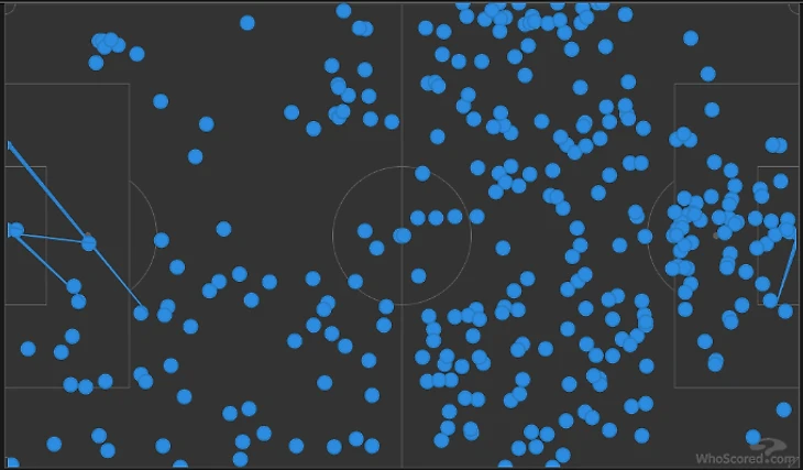 Вот карта первого тайма, когда передачи у гостей проходили (если что – ворота «Ливерпуля» слева):