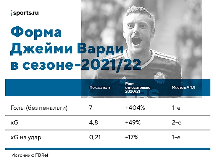 Варди образца этого сезона значительно чаще получает моменты и прекрасно их реализует. Средняя острота каждого удара у него самая высокая в лиге среди тех, кто бил по воротам хотя бы 10 раз.