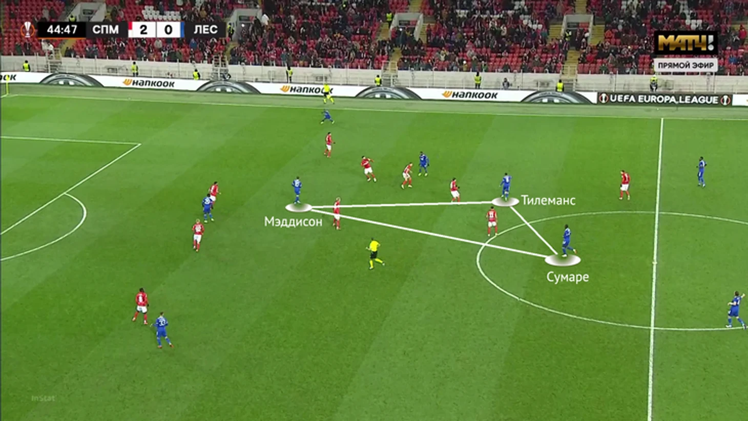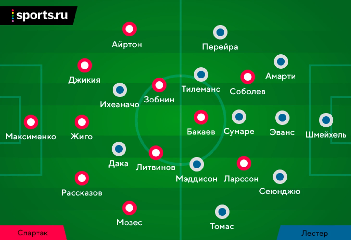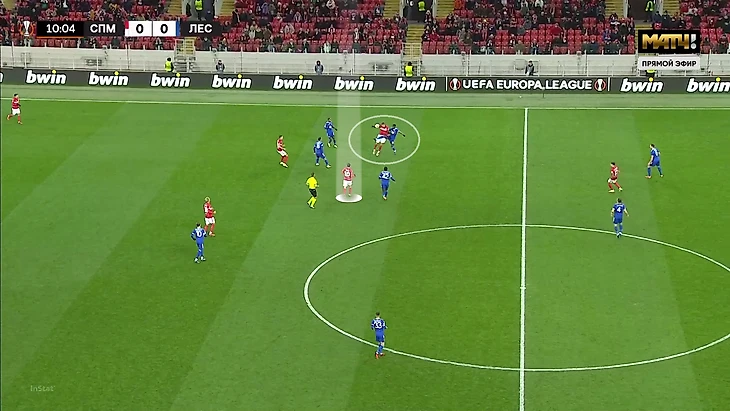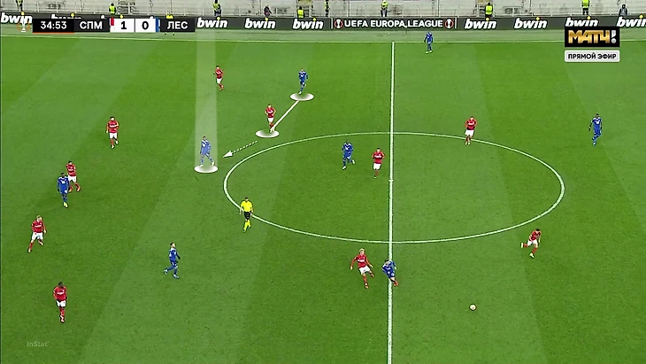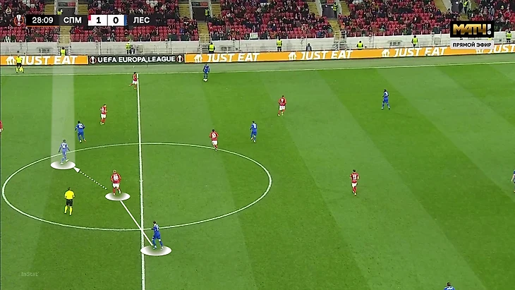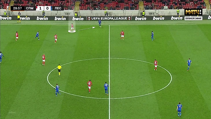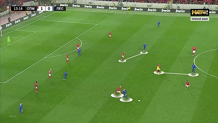 Выбор схемы автоматически означал, что «Спартак» отказывается от постоянного давления на тройку защитников «Лестера» (один из них всегда оставался свободным). Зато позволял отзеркалить схему гостей в полузащите. Наметились три пары – Бакаев против Сумаре, Зобнин против Тилеманса и Литвинов против Мэддисона.