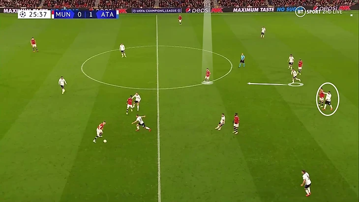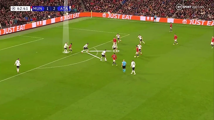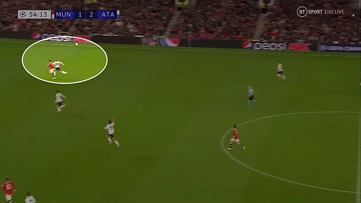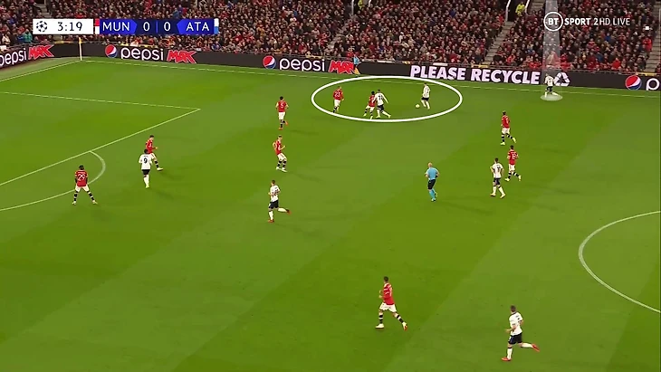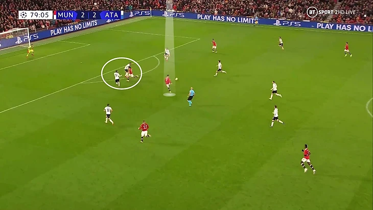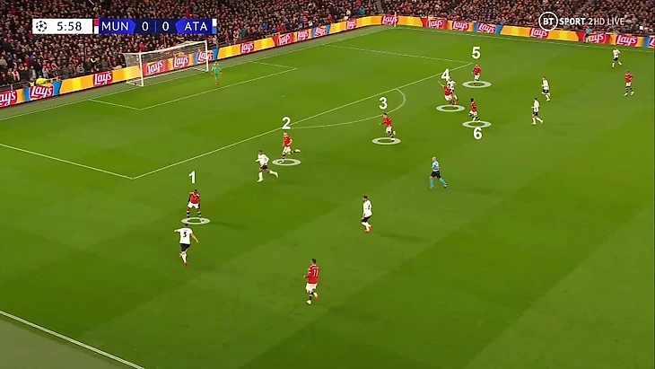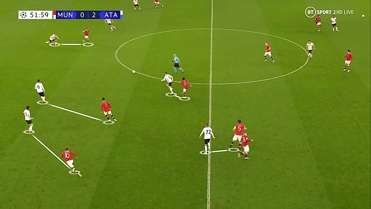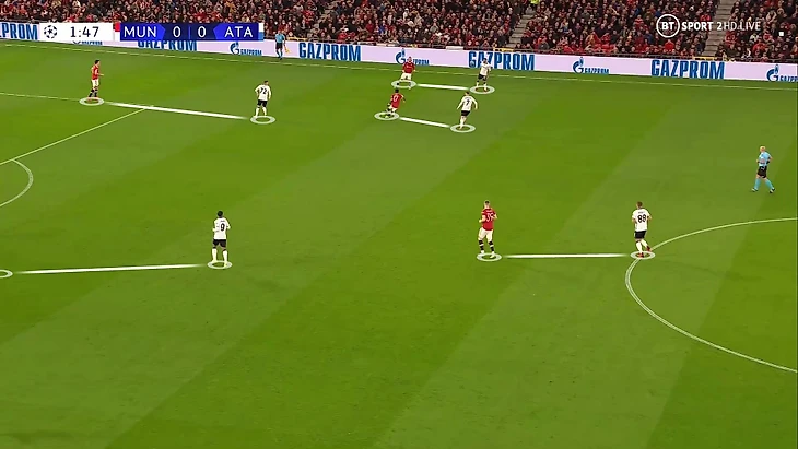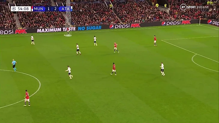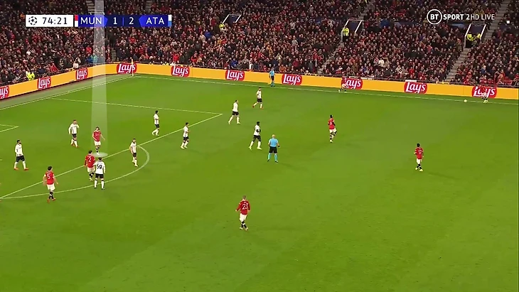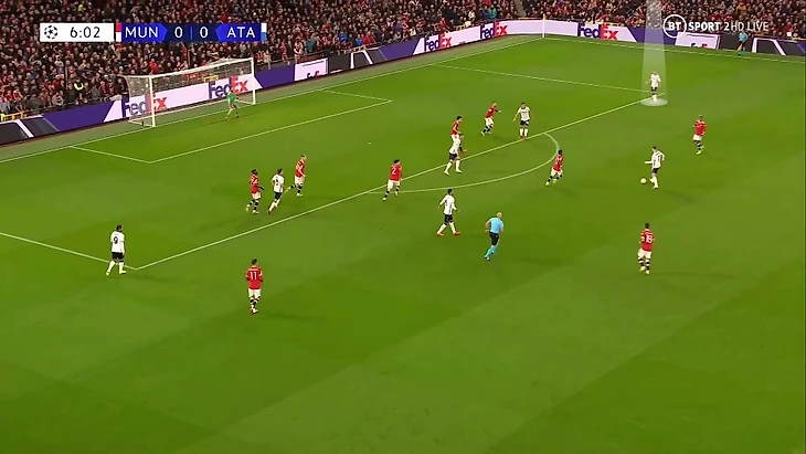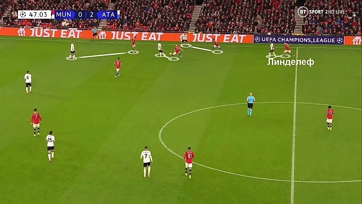 6. Пока территория была у «Аталанты», она управляла ситуацией на поле. При позиционной обороне у «МЮ» за линией мяча 6 игроков. Остальные пассивны и лишь наблюдают за эпизодом: Бруну и Роналду вне кадра, Гринвуд только что играл против Паломино, но резко выключился из эпизода, а Рэшфорд на дальнем фланге не помогает ни против Иличича, ни против Дзаппакосты: