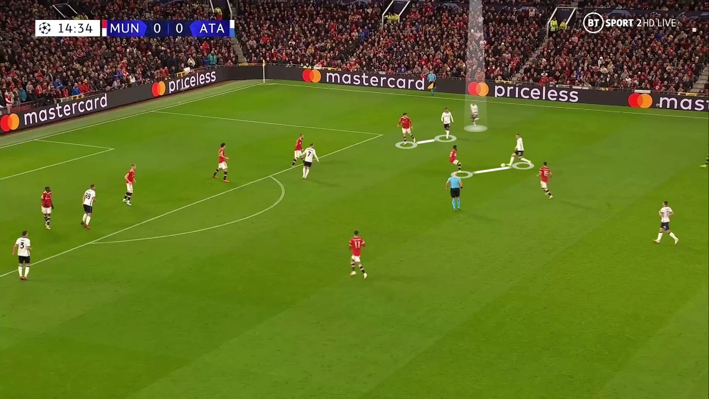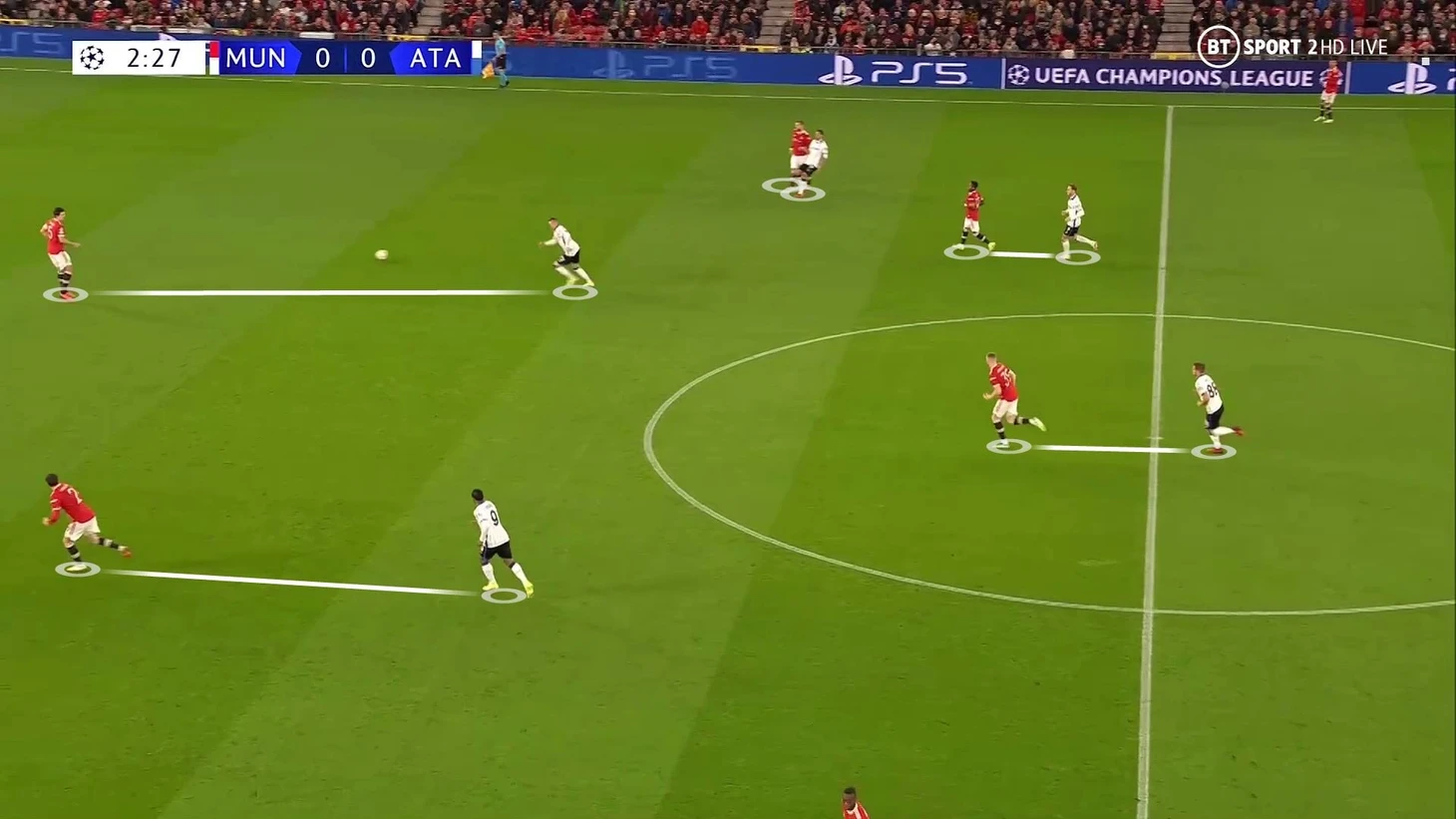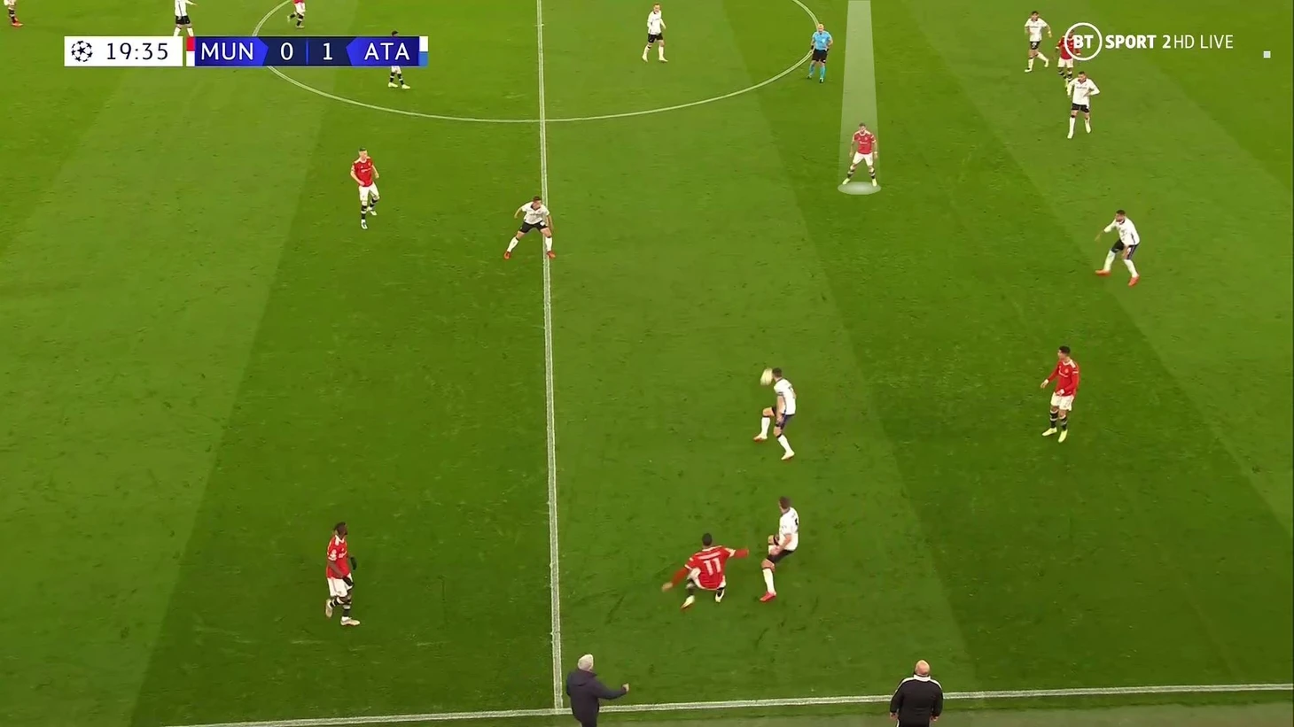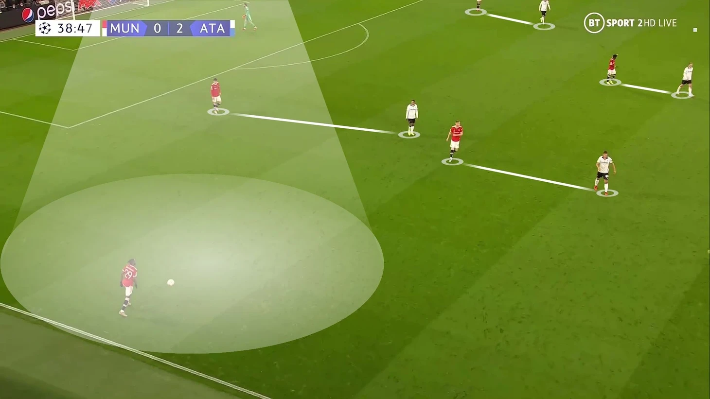 6. Пока территория была у «Аталанты», она управляла ситуацией на поле. При позиционной обороне у «МЮ» за линией мяча 6 игроков. Остальные пассивны и лишь наблюдают за эпизодом: Бруну и Роналду вне кадра, Гринвуд только что играл против Паломино, но резко выключился из эпизода, а Рэшфорд на дальнем фланге не помогает ни против Иличича, ни против Дзаппакосты: