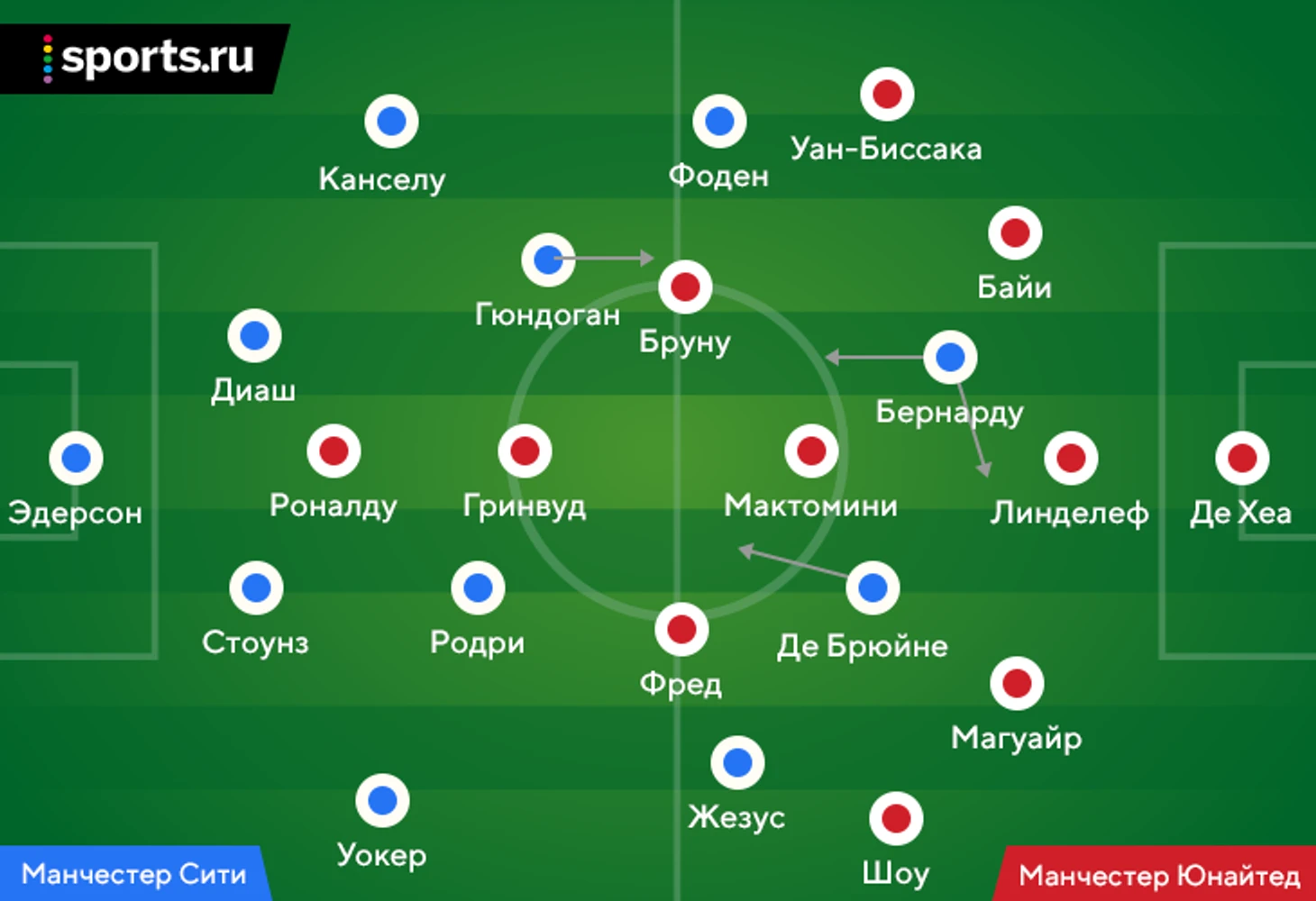 Де Брюйне стартовал нападающим, но часто опускался в глубину для созидания, Гюндоган, наоборот, стартовал глубже, но врывался в штрафную, Бернарду дольше всех находился около штрафной, но не был прикован к одной стороне поля, постоянно менялся позициями с партнерами по атаке. Это лишь частые приемы. В конкретных эпизодах футболисты могли действовать гибче.