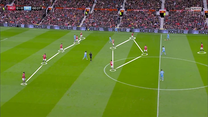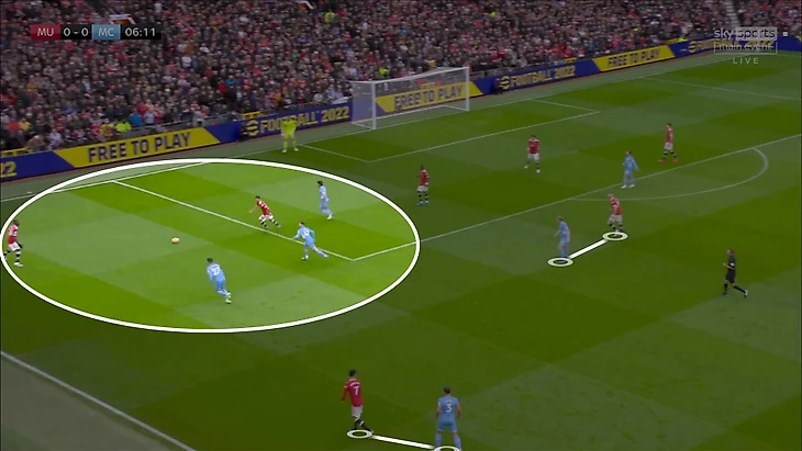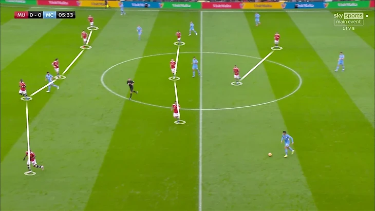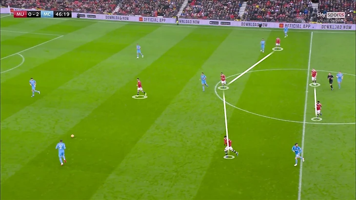 Как заметил Гвардиола, тройка полузащитников «МЮ» не успевала смещаться. В теории это могли компенсировать выдвижения фланговых защитников, но «Юнайтед» не владеет этой схемой достаточно слаженно, поэтому Уан-Биссака и Шоу выдвигались с опозданием.