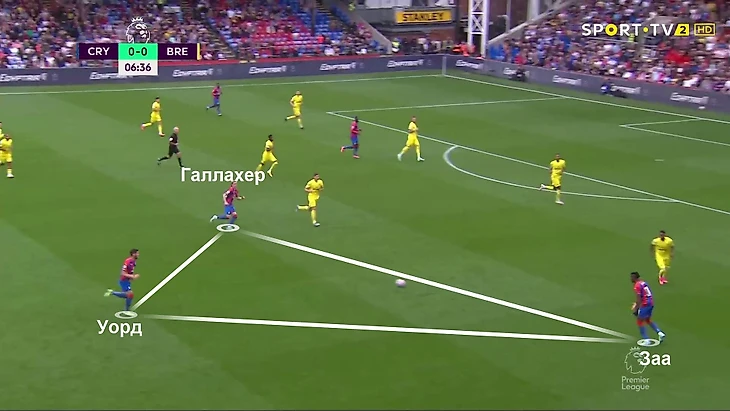 Когда мяч достигает флангов, у «Пэлас» все очень структурно и продуманно – на каждой стороне есть свой треугольник. Выглядит примерно так: