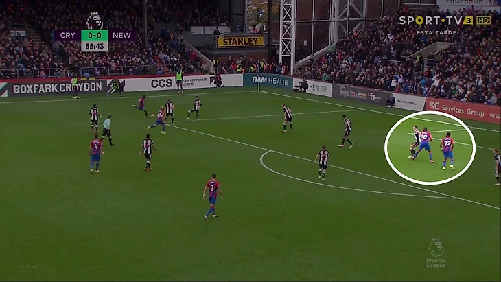 Задача-минимум для каждого треугольника – удерживать мяч, давать «Пэлас» больше контроля. Максимум – напрямую участвовать в создании моментов. На чужой трети у «Пэлас» есть три основных приема: