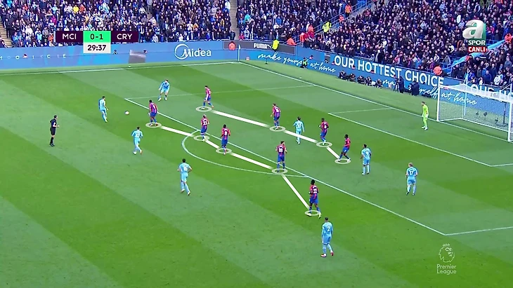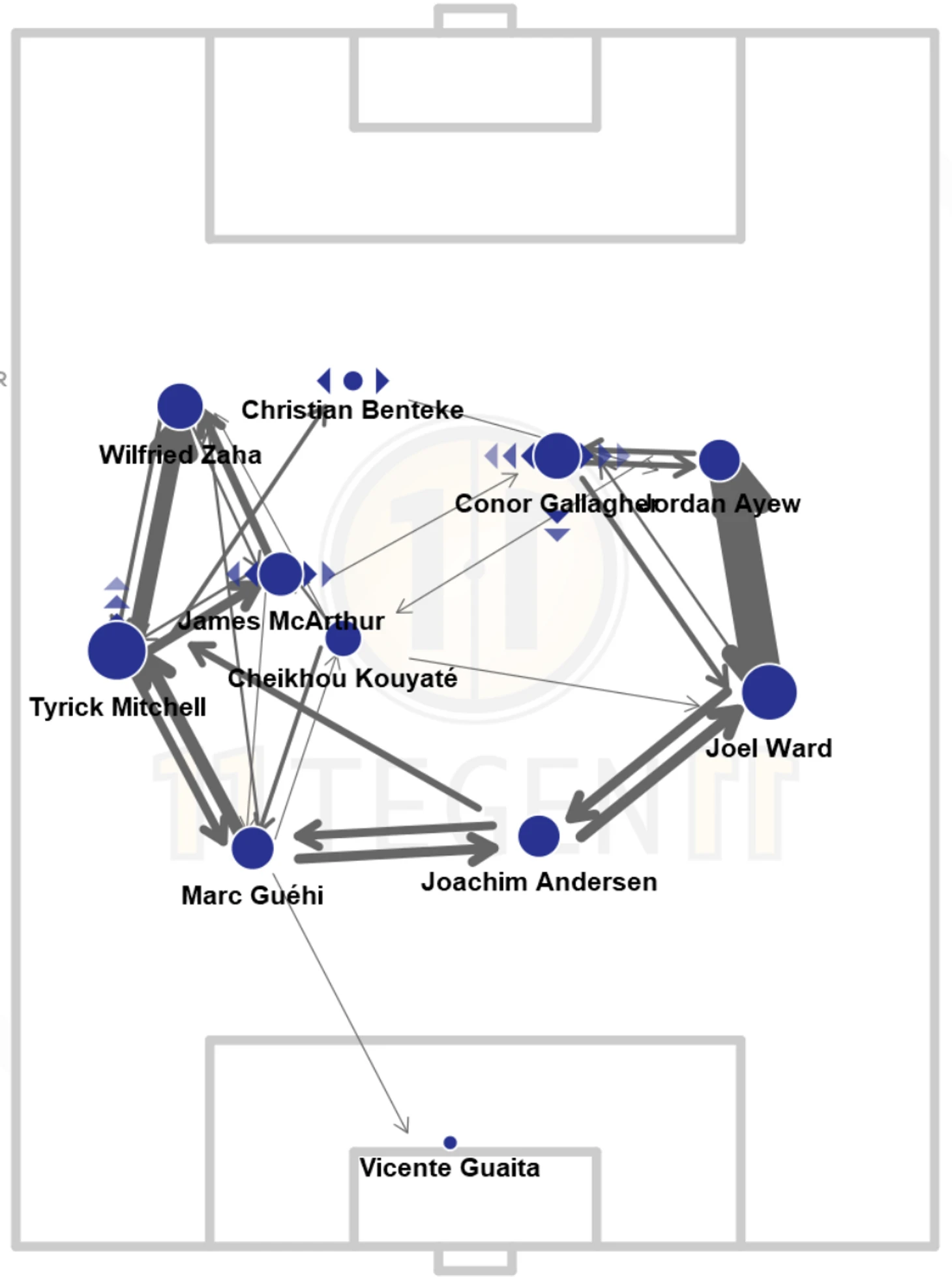 Розыгрыши начинаются с центральных защитников, но дальше огромное внимание уделяется структуре. «Пэлас» умышленно уводит комбинации во фланговые зоны. Есть несколько потенциальных объяснений. Во-первых, у команды нет разыгрывающего опорника – на этой позиции чаще всего выходят Куяте или Миливоевич (чистые разрушители из наследия Роя). Во-вторых, потери во фланговых зонах не так опасны, как в центре (а без разыгрывающего они будут частыми).