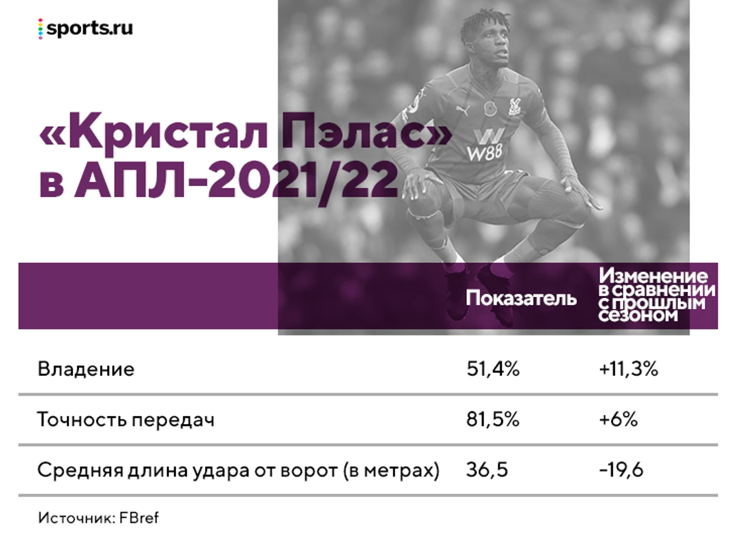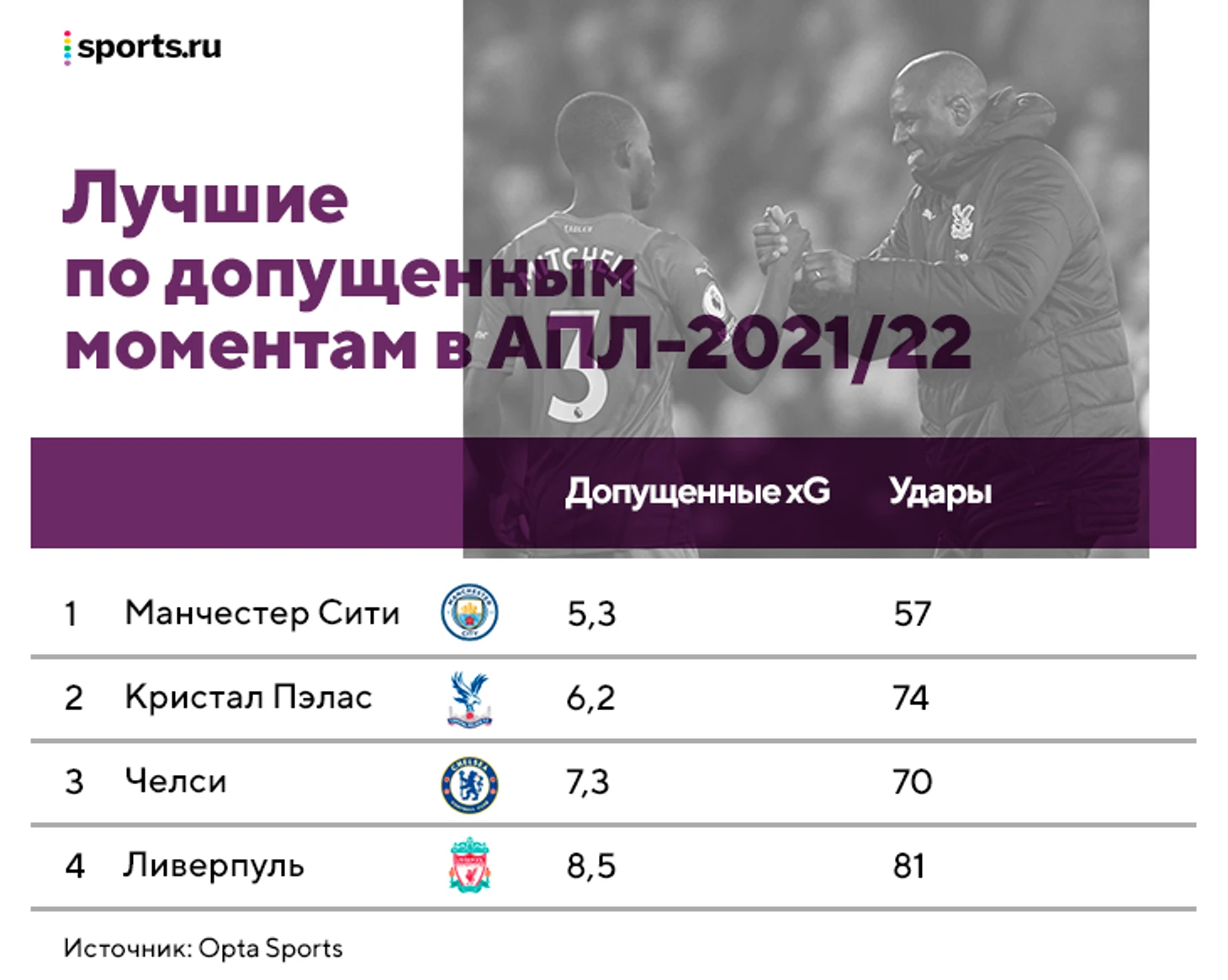 По остроте допущенных моментов «Пэлас» уступает только «Сити». По общему количеству ударов – «Сити» и «Челси». И это при том, что они уже сыграли очные матчи со всеми командами топ-6, кроме «МЮ» (включая супертройку, которая сильнее всех портит статистику).