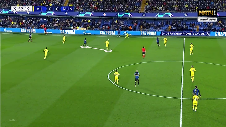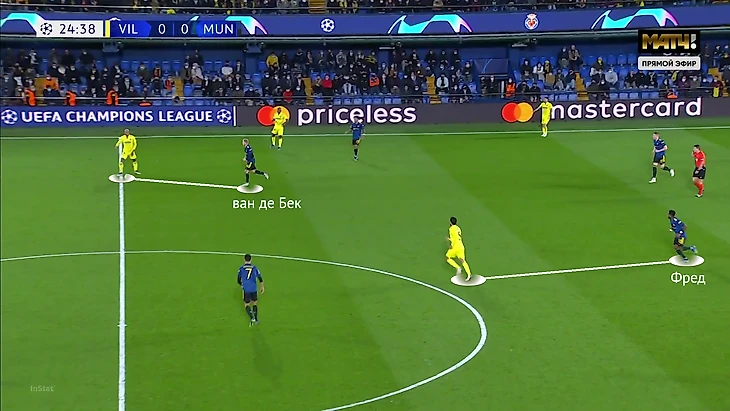 Независимо от наполнения схемы, «МЮ» не рисковал и почти не прессинговал «Вильярреал» на его половине. Главной задачей было перекрыть пару опорников – Капу и Дани Парехо. Им позволяли принимать, но не продвигать мяч. Явный акцент – эпизоды, когда игроки «МЮ» ситуативно менялись позициями, но все равно выполняли установку.