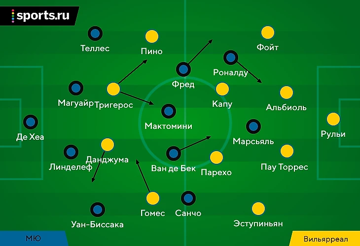 Оценить схему-трансформер полноценно не удалось. В первом тайме «МЮ» почти не переходил с мячом на половину «Вильярреала» – на чужой трети поля сделали только 35 передач. Если мяч и переходил к «Юнайтед», то, как правило, это были попытки пройти прессинг хозяев. Полноценно закрепиться в атаке у гостей не получалось.