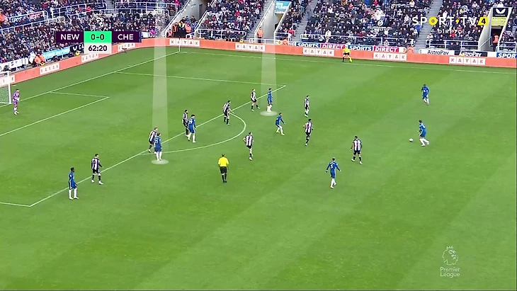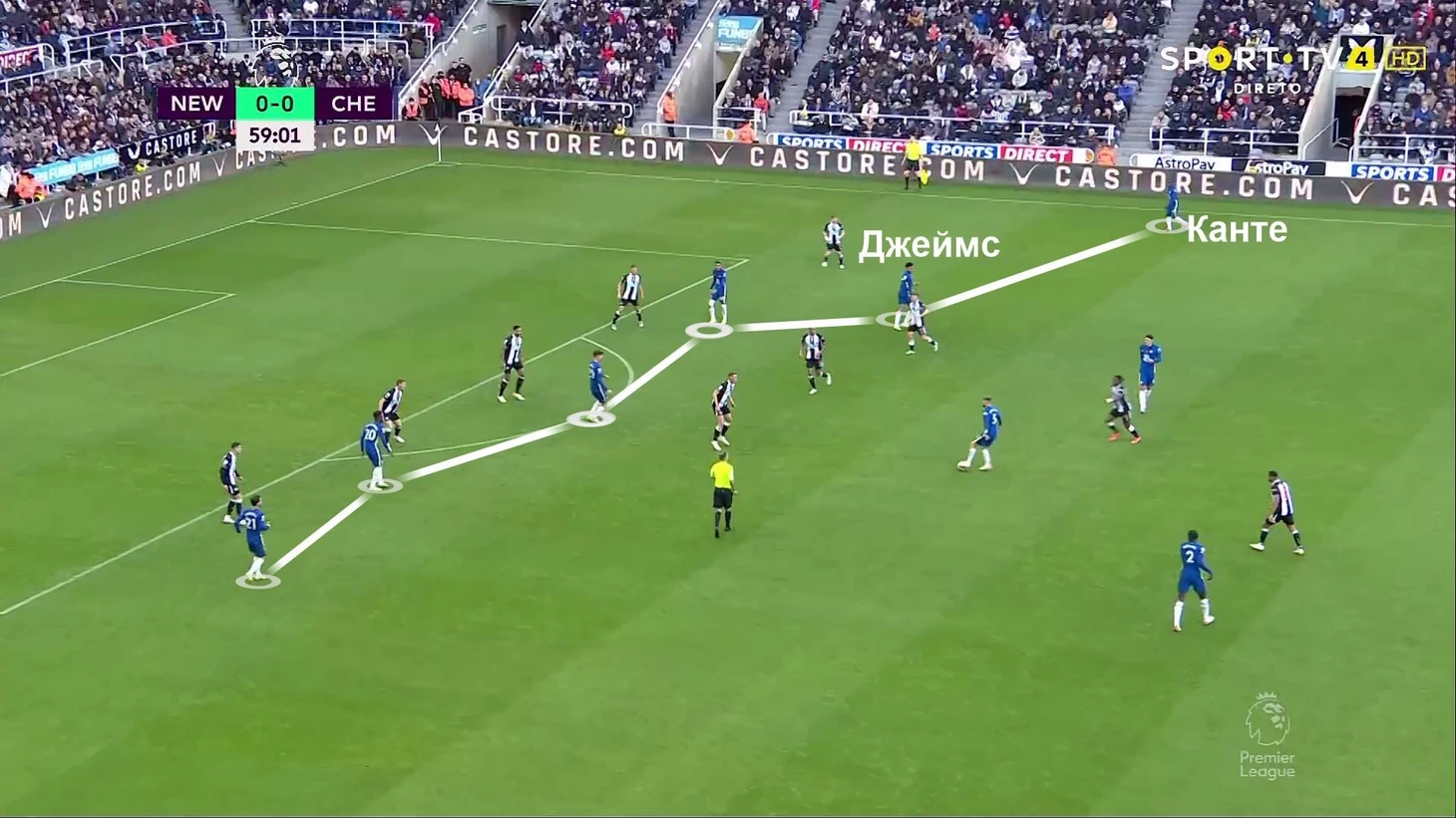 • При необходимости Тухель добавлял в последнюю линию шестого игрока. Из-за гибкости сочетаний в атаке это не вносило дисбаланс, а, наоборот, помогало раскрывать трудные матчи. Например, не забив в первом тайме «Ньюкаслу», Тухель попросил Канте при позиционных атаках играть правого латераля: