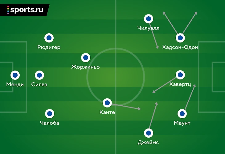 Гибкая атака «Челси» в этих встречах выглядела примерно так – ложного форварда исполнял Кай Хавертц, забивные латерали получали особенно явную свободу для смещения на ударные позиции, под них адаптировались атакующие полузащитники: