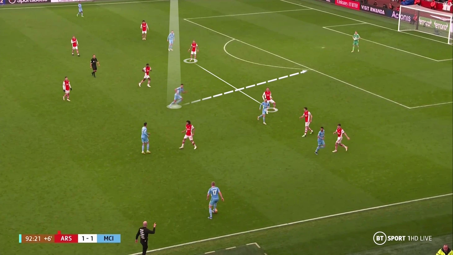 Тут Аке получил огромную свободную зону из-за того, как Лапорт вытащил Сака поближе к себе и в идеальный момент исполнил пас налево: