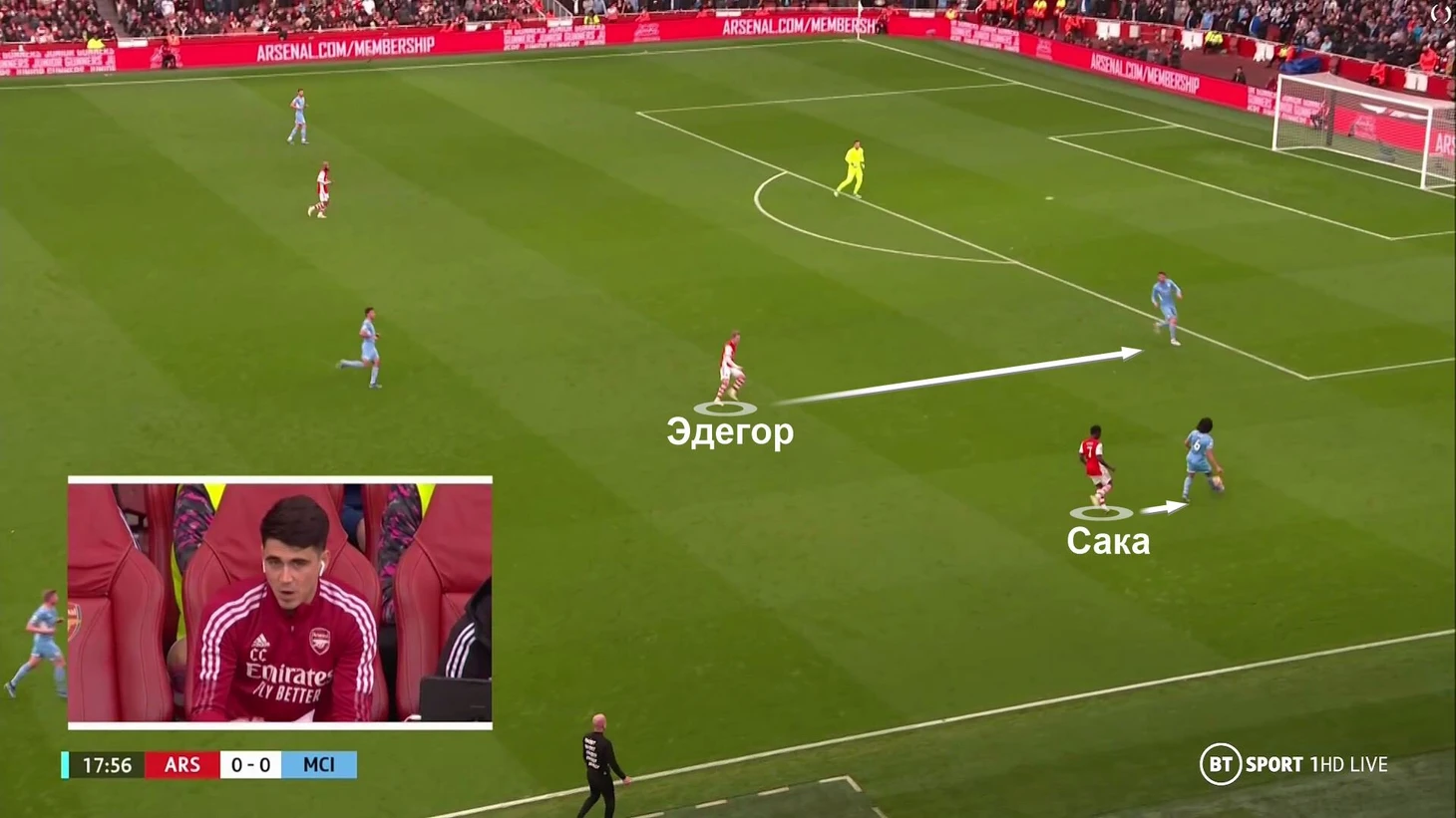 На первом этапе встречи «Арсенал» достойно сдерживал «Ман Сити» (как именно, разберем ниже) – гости создавали угрозу только со стандартов. При этом «Арсенал» опасно атаковал на пространстве – в контратаках или после неудачного прессинга «Сити». Именно команда Артеты была острее на этом отрезке.