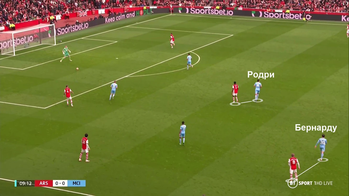 Реже «Арсеналу» удавалось преодолевать прессинг через пасы от защитников, но принцип был тем же. Провоцирующие передачи, ожидание Родри и Бернарду в прессинге – и только потом продвижение.