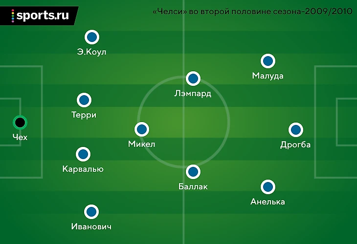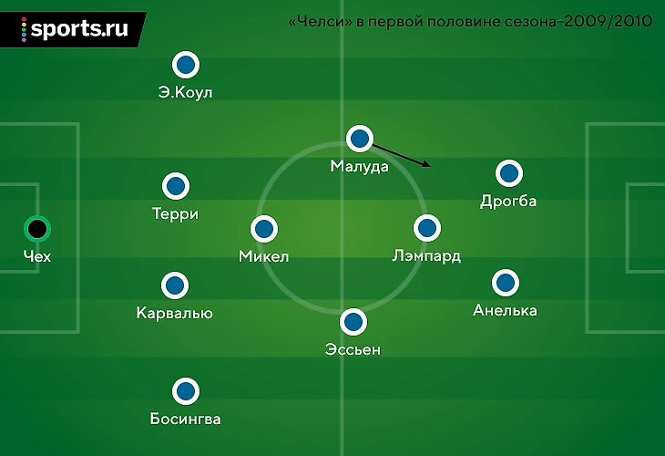 Вторую половину золотого сезона «Челси» провел с другой схемой – чем-то средним между 4-3-2-1 и 4-3-3. Анелька/Джо Коул и Малуда теперь были в атакующей тройке:
