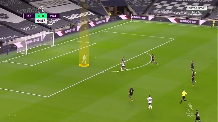 Эдерсон же наоборот не всегда принимает качественные решения, связанные с выходом из ворот. Из-за этого оказывается в абсурдном положении – и ворота оставляет, и от соперника далеко (а защитник наоборот уже почти с ним поравнялся и догнал):
