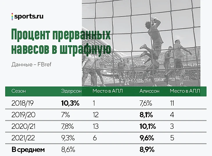 По этой метрике показатели Алиссона и Эдерсона более-менее равные. В первом совместном сезоне в АПЛ они вообще были в числе лучших. Потом скатились, но не драматично. Кажется, сильных вратарей в Англии просто стало больше (Эдуар Менди в «Челси», Жозе Са в «Вулвз»), а кто-то выдает абсурдные крутые кампании, а потом исчезает из топа (Эмилиано Мартинес в сезоне-2020/21, Бернд Лено в сезоне-2019/20).