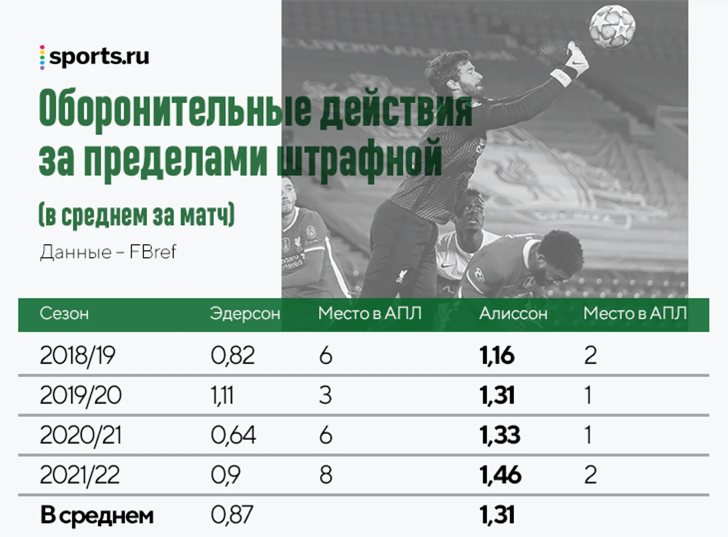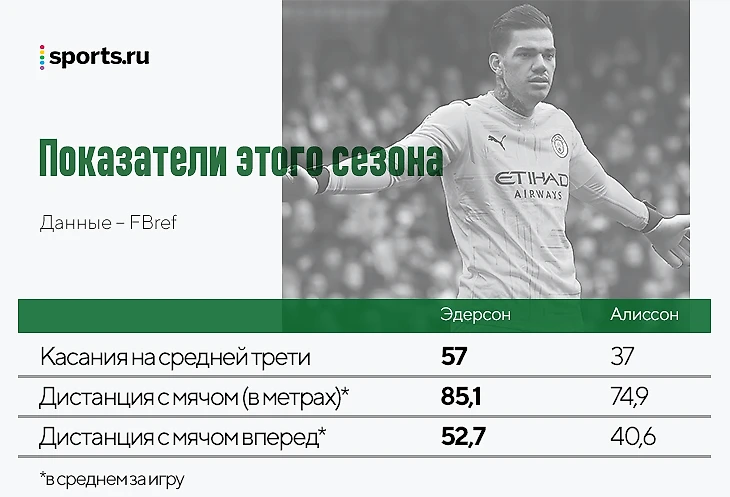 Эдерсон проигрывает соотечественнику, но, вероятно, причина в контрастах между «Ливерпулем» и «Сити». Во-первых, команда Гвардиолы больше владеет мячом (68,5% против 62,5%); во-вторых, не так интенсивно прессингует (37,6 прессинг-действий на чужой трети поля за матч против 43). Глобально стиль двух клубов похож, но конкретно в этом отношении он радикальнее у «Ливерпуля» – грубо говоря, вынуждает вратаря чаще выходить из ворот и страховать.