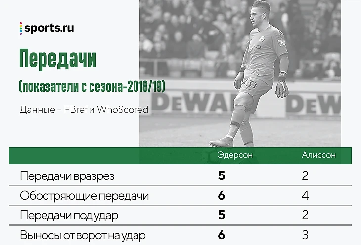 Важно: несмотря на то, что у Эдерсона практически уникальные навыки, Алиссон не сильно от него отстает. У обоих, например, по две голевые передачи в АПЛ. Обе свои Алиссон отдавал на Мо Салаха – поэтому тезис «может найти передачей даже нападающего» вполне применим и к вратарю «Ливерпуля», который (не забываем) иногда и сам может стать нападающим.