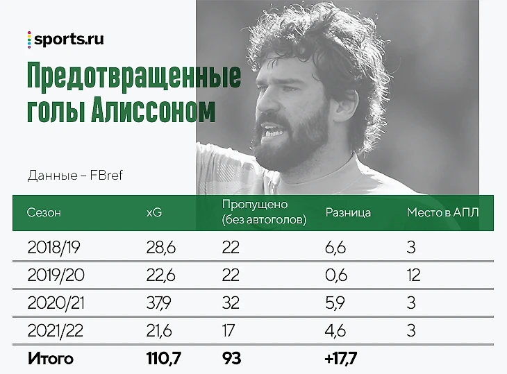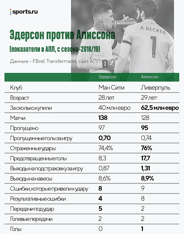 Важно: оценивать будем только по АПЛ и только после прихода Алиссона в «Ливерпуль» (лето-2018) – то есть по последним четырем сезонам. Кубковые турниры отмели из-за слабой выборки и непредсказуемого уровня соперников – жеребьевка может подкинуть разные по силе команды, в отличие от регулярного чемпионата, где оба сталкиваются с одними и теми же клубами.