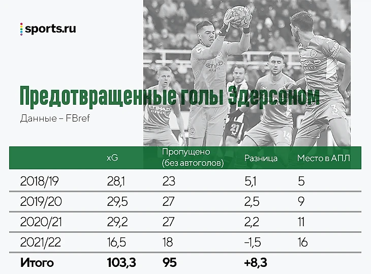 Начнем с Эдерсона. У него был хороший сезон-2018/19 (место в топ-5 АПЛ), но затем кипер «Сити» начал сползать. Этот сезон – пока худший для него на отрезке, но, возможно, часть проблем – в отсутствии хотя бы минимального объема работы. В общей сложности предотвратил около 8 голов за четыре сезона.