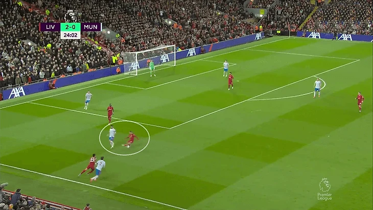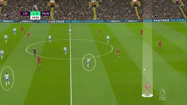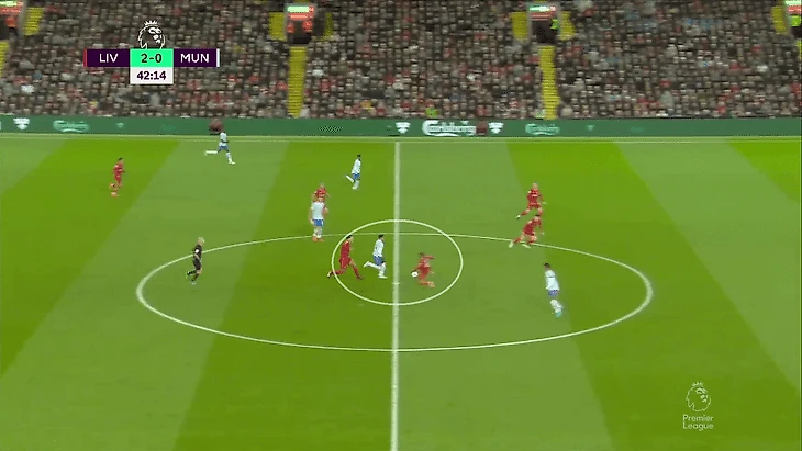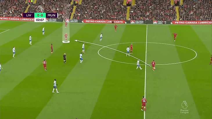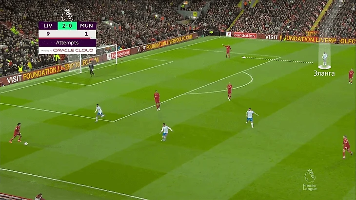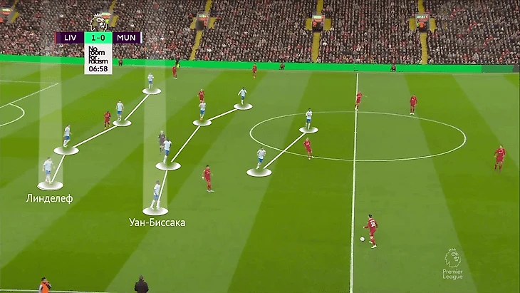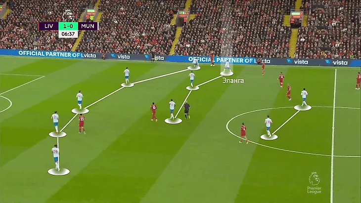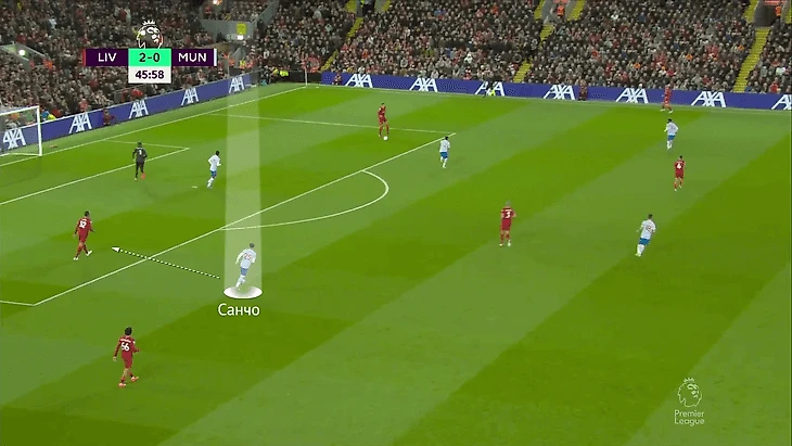 Первый – разобрать пару центральных защитников. Для этого в помощь к Рэшфорду выдвигался кто-то из вингеров (либо Санчо, либо Эланга). Крайнего защитника «Ливерпуля» оставляли свободным, но так, чтобы до него нельзя было перевести мяч: