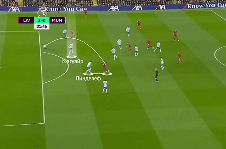 При первом голе Диогу Далот выскочил на Салаха, а вот Магуайр не стал выдвигаться на Мане (возможно, смутило, что Далот уже начал проигрывать Мо на дистанции). В результате ужасное комбо – и помешать не смог, и партнера подставил, и пространство оголилось: