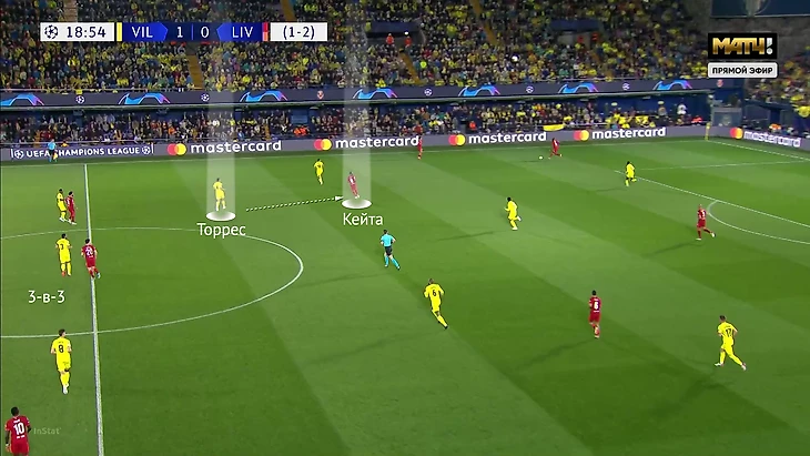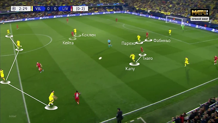 Структура тоже была интересной. Пара нападающих Диа – Морено действовала по центральным защитникам «Ливерпуля». В следующей линии Дани Парехо поднимался к Фабиньо, а Этьен Капу играл по Тиаго. Свободным в полузащите гостей оставался Наби Кейта, но его поочередно брали Франсис Коклен (когда мяч был на противоположном фланге и можно было проигнорировать Трента) и Пау Торрес (когда Коклен был занят Трентом).